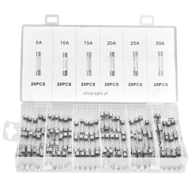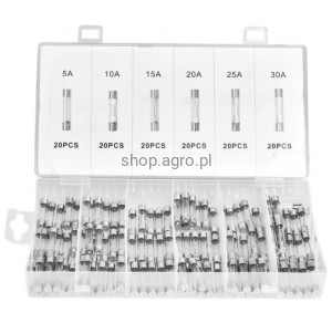 Zestaw KD1302 zawiera 120 sztuk bezpieczników szklanych w popularnych wartościach prądowych: