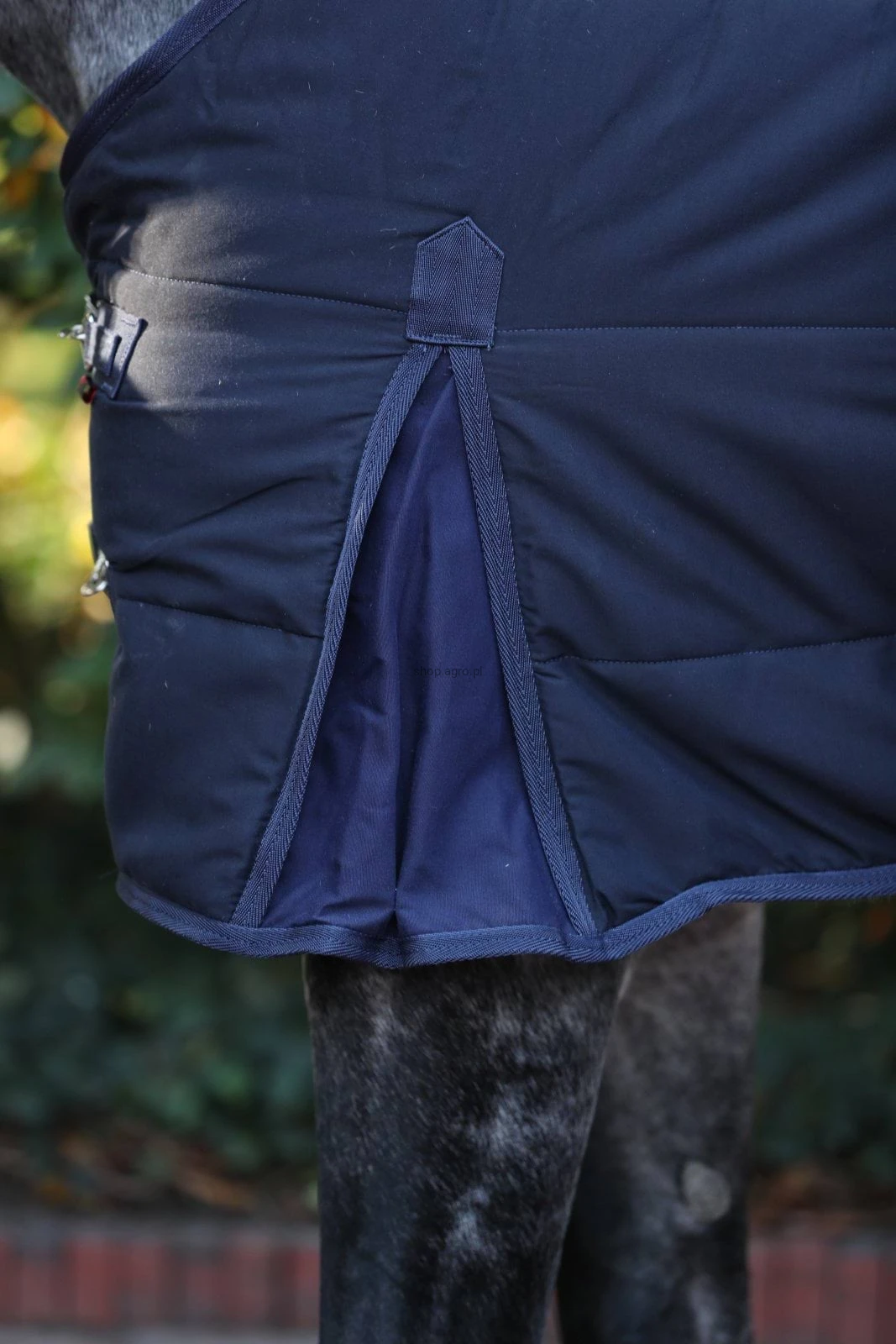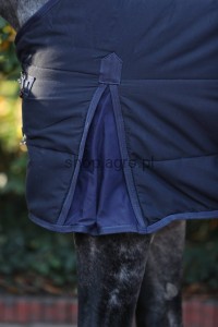 - atrakcyjna derka do stajni z umieszczonymi na zewnątrz pasami krzyżowymi na brzuchu