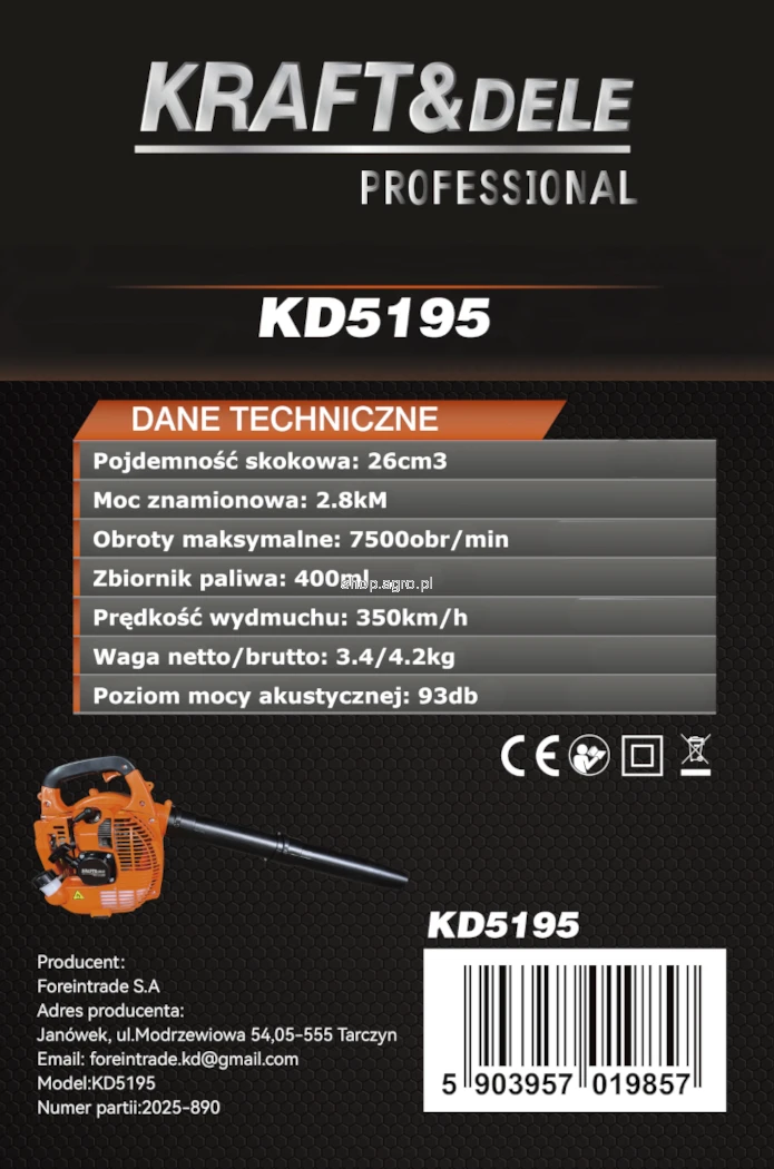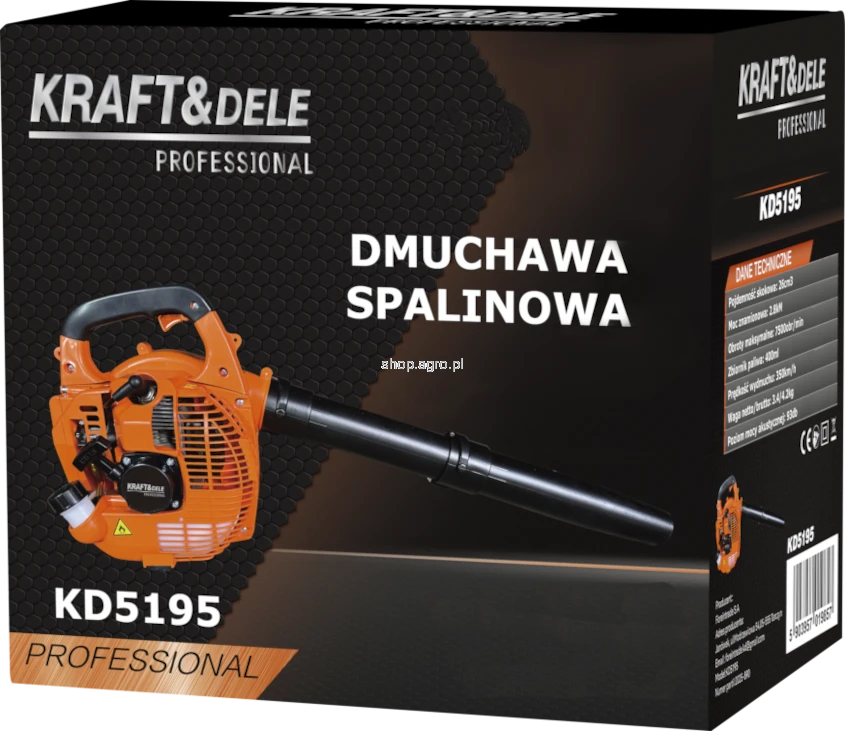 Dmuchawa spalinowa KD5195 marki KRAFT&DELE to wydajne i poręczne urządzenie przeznaczone do szybkiego usuwania liści, trawy, drobnych gałęzi oraz innych zanieczyszczeń z podjazdów, chodników, ogrodów i terenów zielonych. Dzięki kompaktowej konstrukcji oraz wysokiej mocy silnika urządzenie zapewnia skuteczną pracę nawet w trudniejszych warunkach.