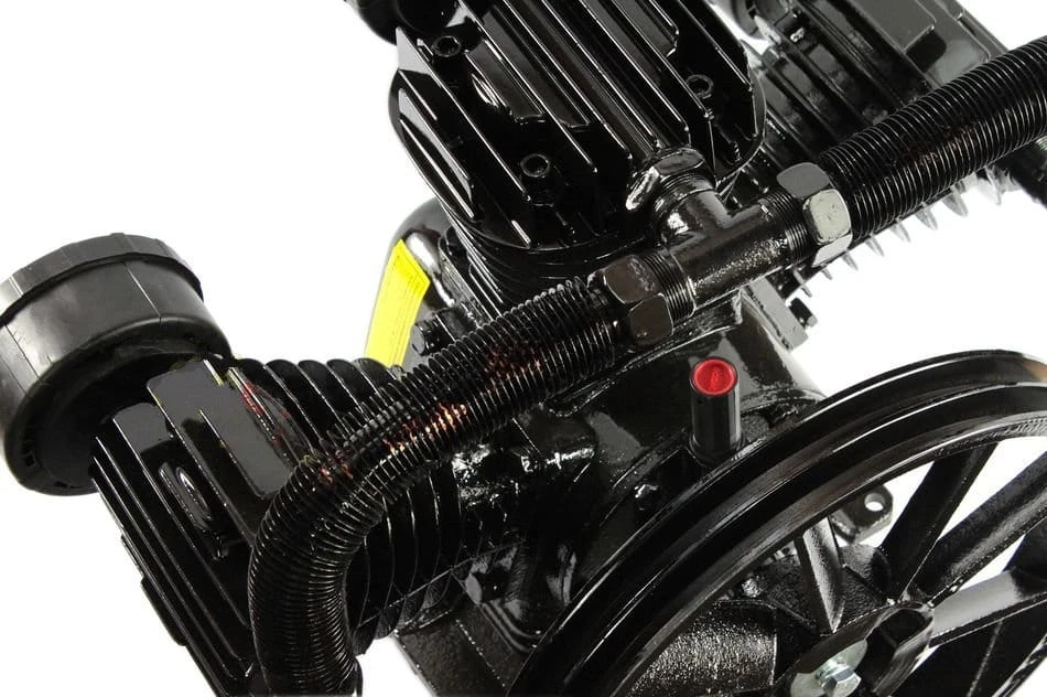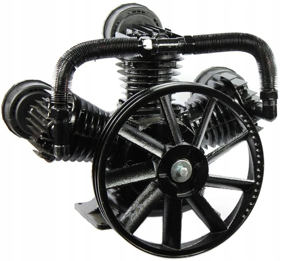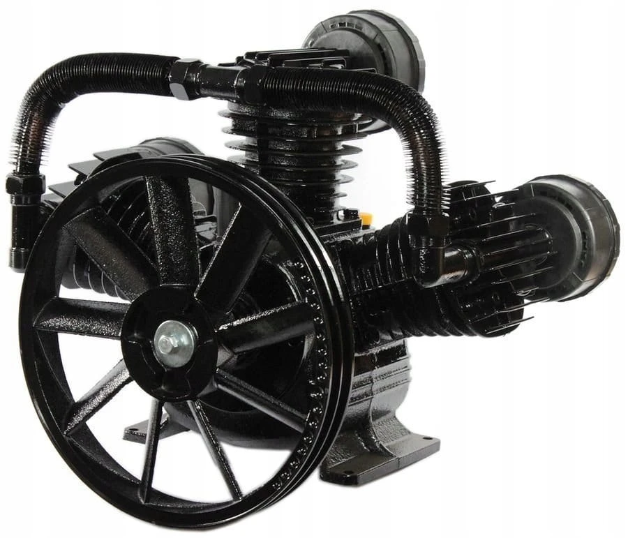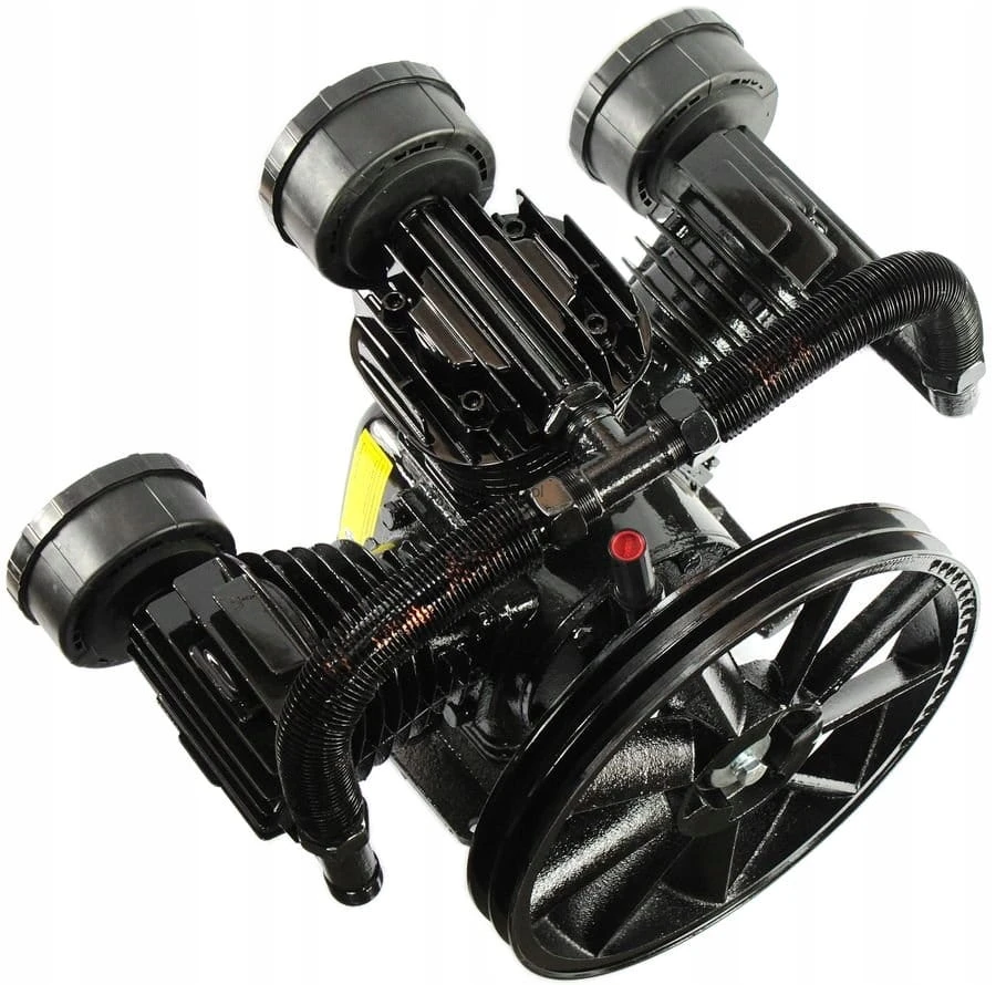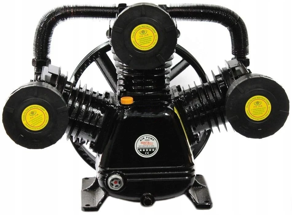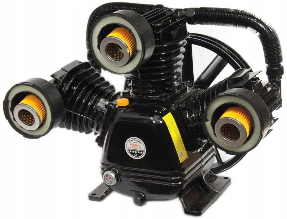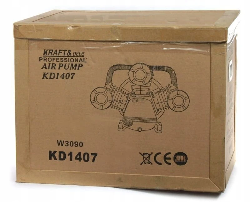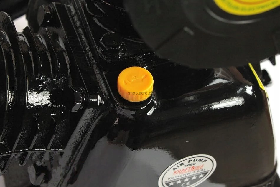 - Sprężarka powietrza trzytłokowa W-0.9/8 marki Kraft&Dele smarowana olejem, wyposażona w koło pasowe, które jednocześnie chłodzi kompresor oraz w boczne chłodnice powietrza.