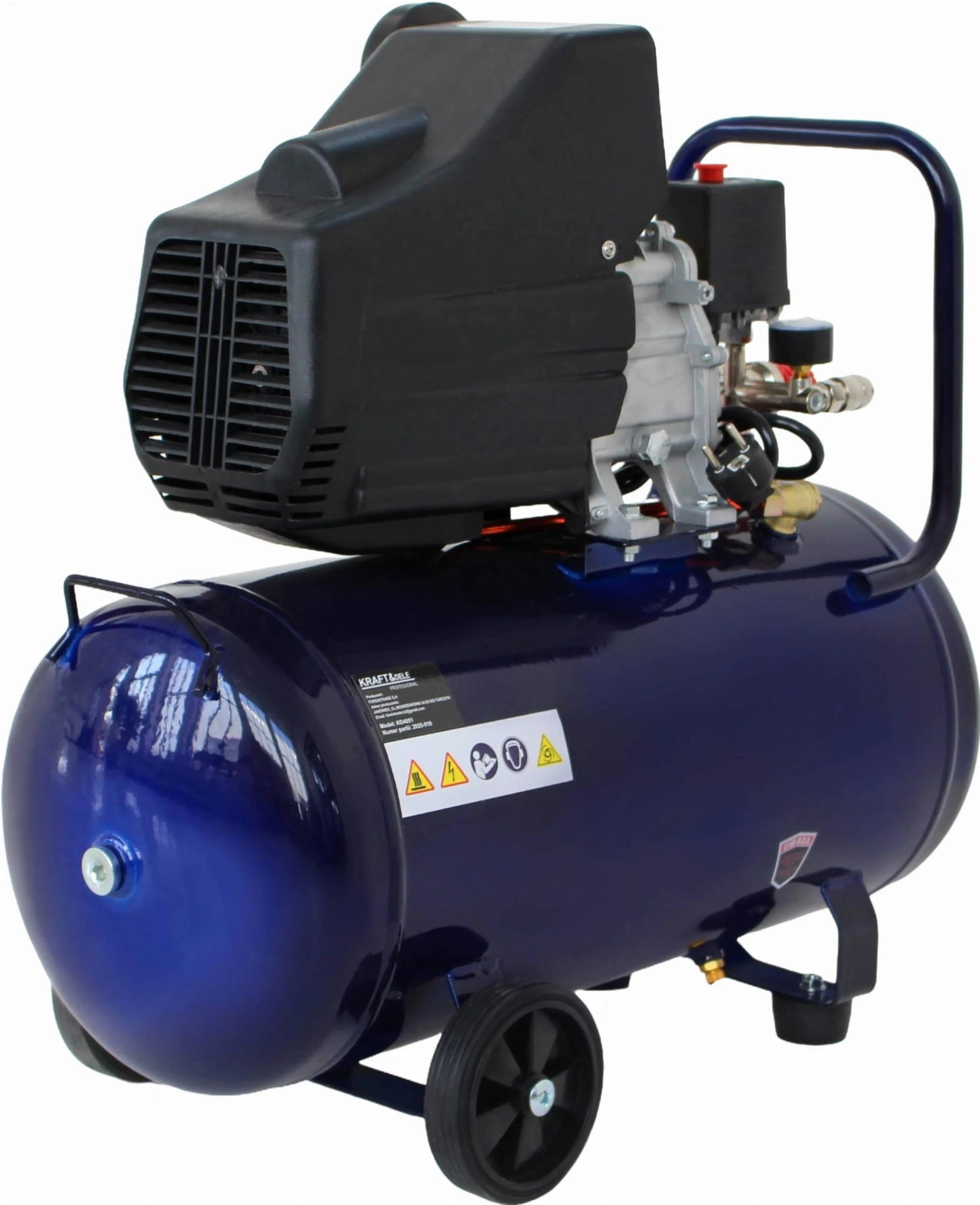 Model KD4051 został wyposażony w wydajny silnik jednotłokowy o mocy 2.8 kW, który gwarantuje efektywną pracę przy zachowaniu stosunkowo cichej pracy. Kompresor posiada czytelne manometry, szybkozłącza oraz presostat umożliwiający automatyczną kontrolę pracy urządzenia. Duże koła transportowe oraz ergonomiczna rączka pozwalają na łatwe przemieszczanie, a zawór spustowy ułatwia odprowadzanie skroplin ze zbiornika. Osłona jednostki napędowej zwiększa bezpieczeństwo użytkowania oraz chroni elementy robocze.