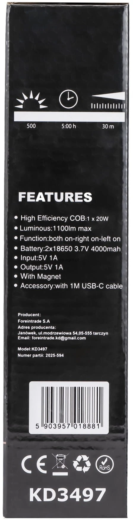 Model KD3497 wyposażony jest w wysokowydajną diodę COB 20W generującą mocne światło o jasności aż 1100 lm. Magnetyczne uchwyty obrotowe oraz obrotowy hak umożliwiają szybkie i stabilne zamocowanie latarki na metalowych powierzchniach lub zawieszenie w dowolnym miejscu. Dodatkowym atutem jest wbudowany gwint 1/4-20, pozwalający na montaż na statywie.