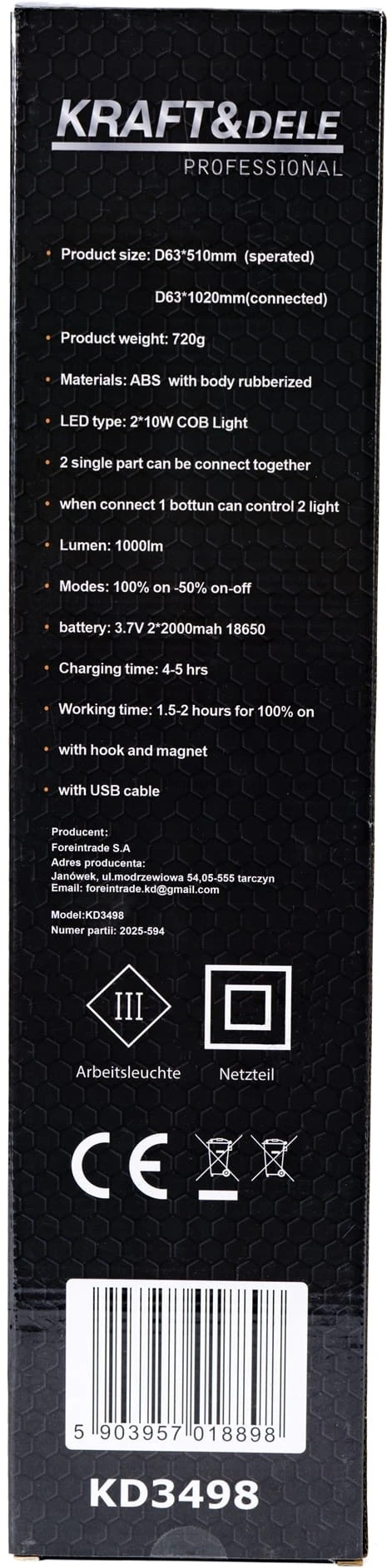 KD3498 to podwójna latarka warsztatowa o wysokiej mocy światła, stworzona z myślą o intensywnej pracy w warsztatach, serwisach oraz w zastosowaniach domowych. Wyposażona w dwa moduły COB 10W, może pracować zarówno jako jedna długa lampa o długości aż 1020 mm, jak i dwie niezależne latarki, co daje maksymalną elastyczność użytkowania.