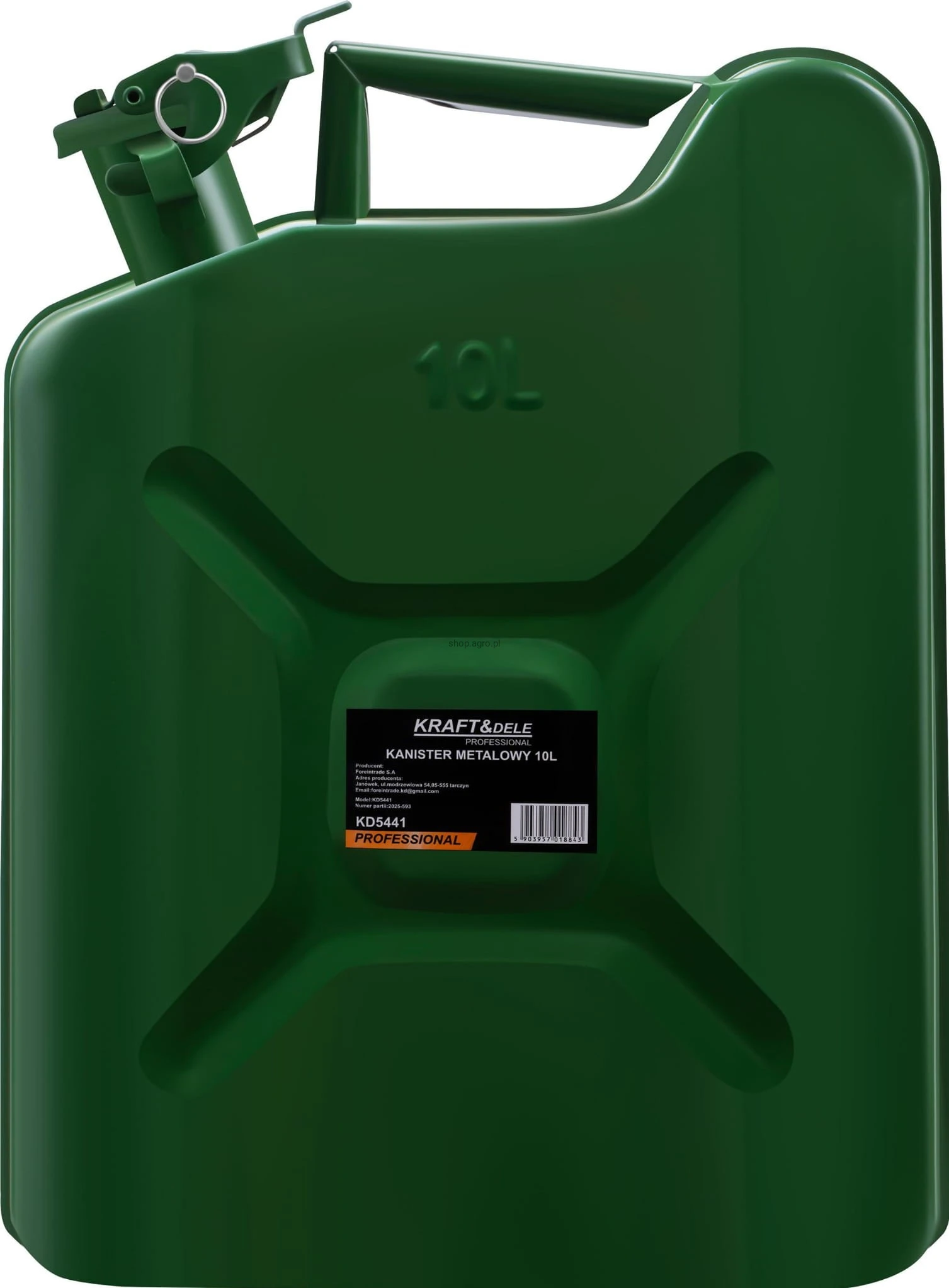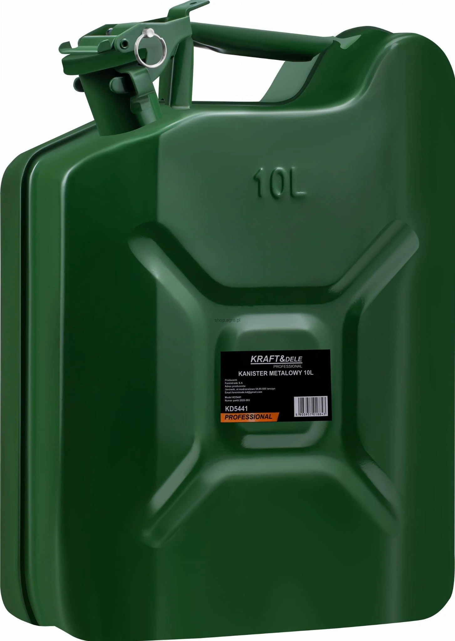 Kanister metalowy 10L; kanister na paliwo; kanister na benzynę; kanister na olej napędowy; metalowy kanister paliwowy; pojemnik metalowy na paliwo; kanister samochodowy; kanister terenowy; kanister KRAFT&DELE KD5441;