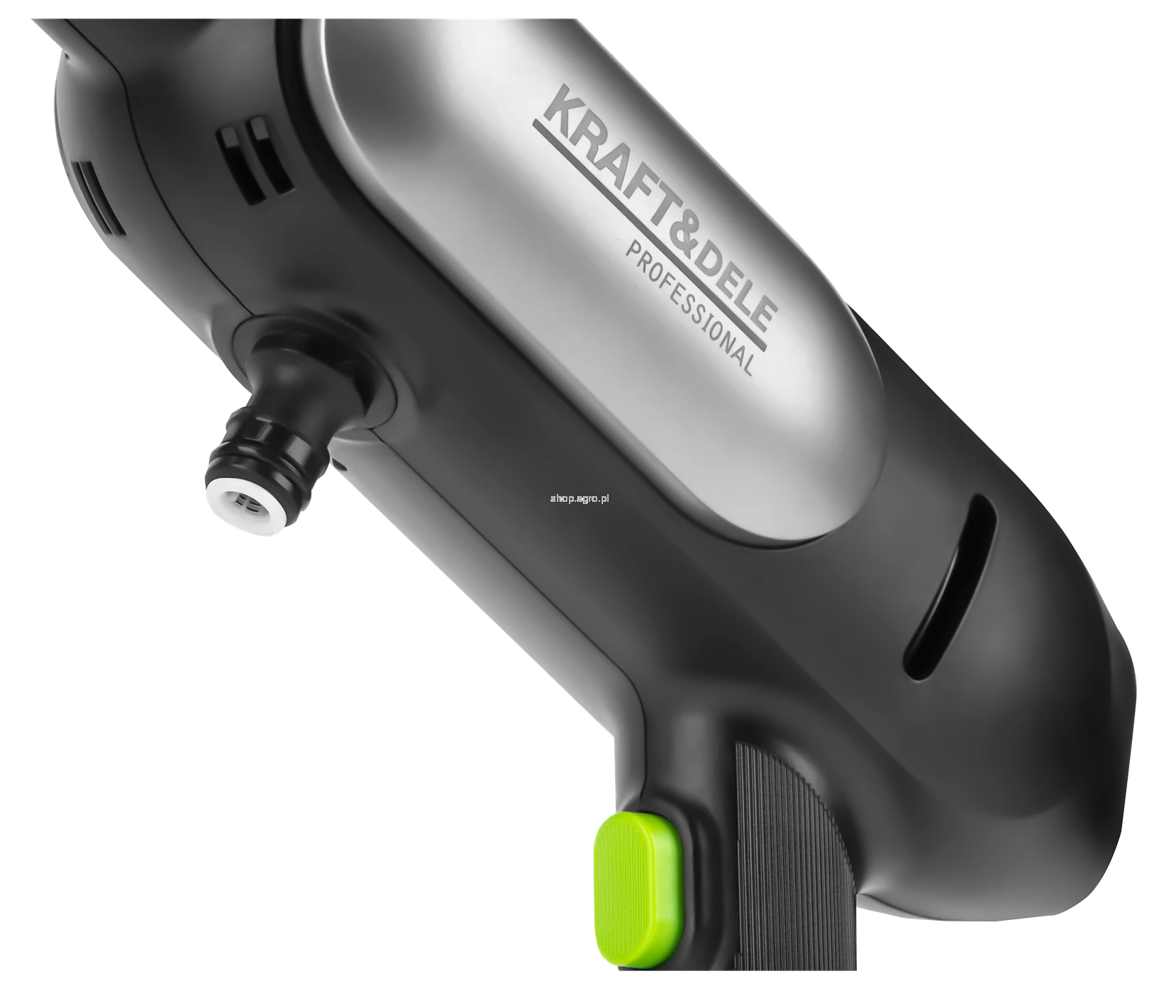 KD5375 to myjka ciśnieniowa zasilana akumulatorem litowo-jonowym 21V. Jest to wyjątkowo kompaktowy produkt – całe urządzenie jest niewielkie i lekkie, dzięki czemu łatwo je przenosić i obsługiwać jedną ręką. To nie jest standardowa myjka stacjonarna z lancą i dużą jednostką – w tym przypadku mamy malutkie, samodzielne urządzenie zasilane akumulatorem, do którego podłączamy jedynie wodę, co zapewnia pełną mobilność i wygodę pracy w każdym miejscu.