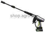 Dzięki możliwości podłączenia do sieci wodociągowej lub pracy z pojemnika z wodą, myjka zapewnia pełną elastyczność. Blokada spustu zwiększa wygodę użytkowania, a regulowana dysza oraz przycisk sterowania prędkością pozwalają dostosować strumień wody do potrzeb.