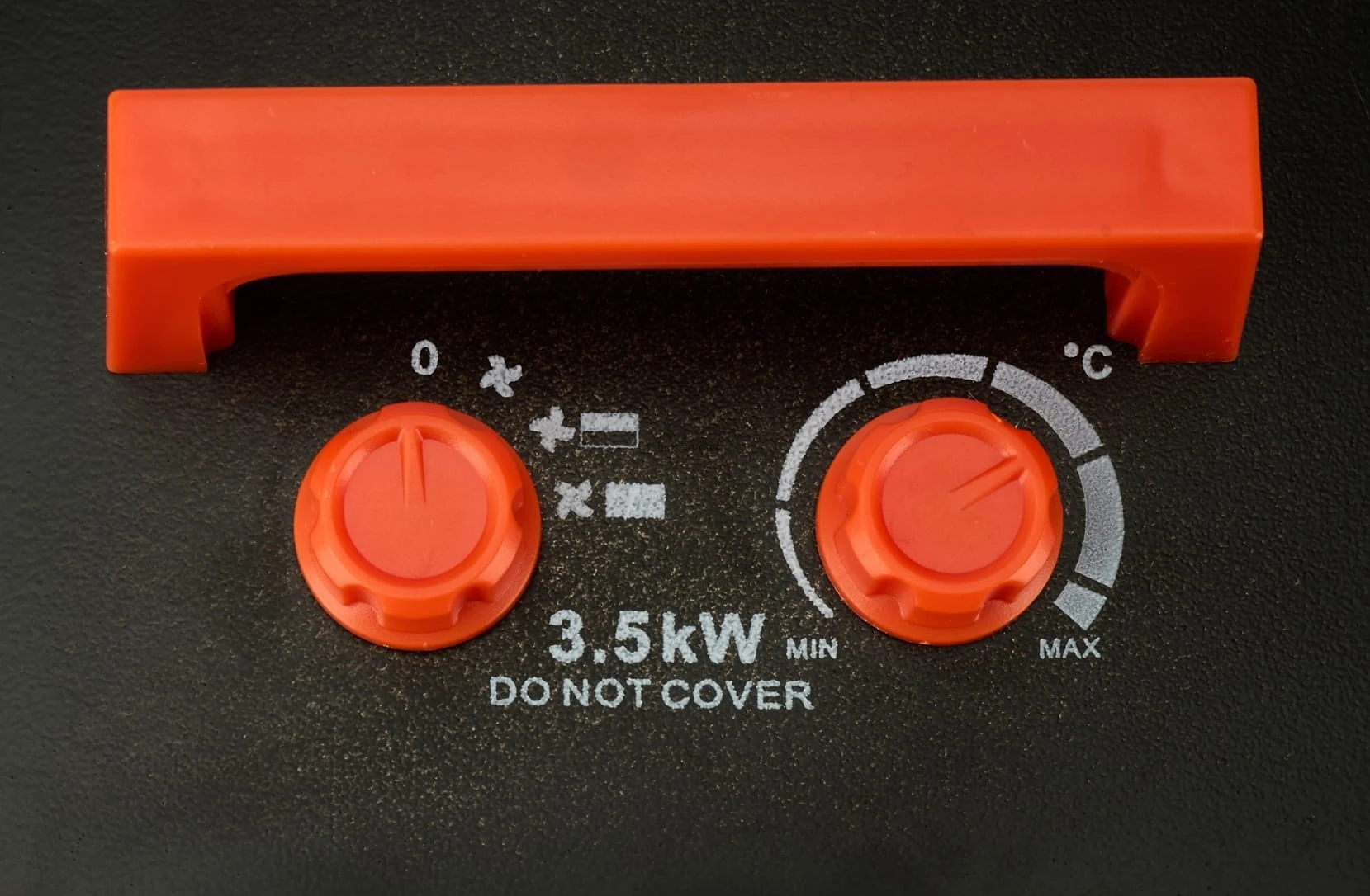 Na panelu sterowania znajdują się dwa intuicyjne pokrętła: lewe odpowiada za wybór trybu pracy i poziomu ogrzewania, natomiast prawe służy do regulacji termostatu i ustawienia pożądanej temperatury. Element grzejny wykonany jest ze stali nierdzewnej, a solidna obudowa pokryta została żaroodpornym lakierem.