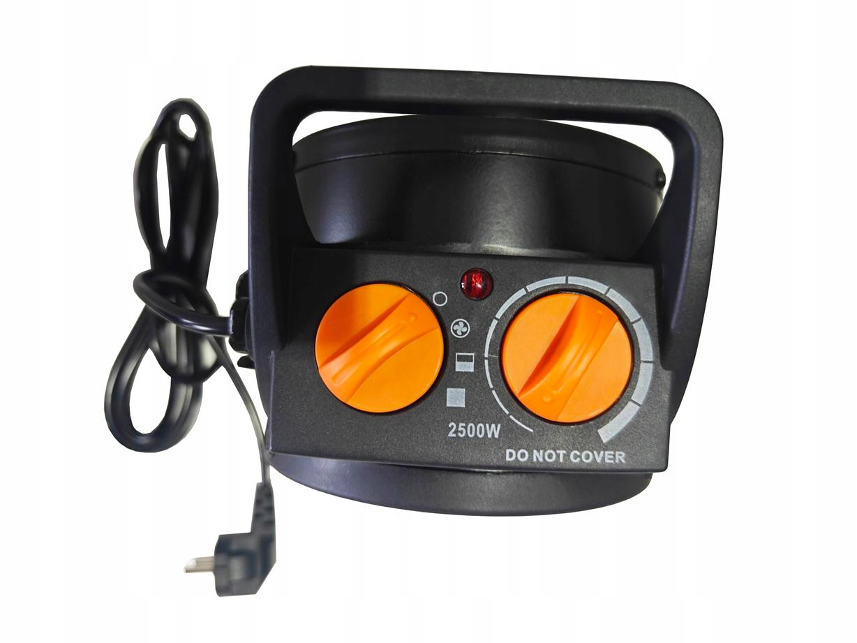 - ▶️Lewe pokrętło umożliwia wybór trybu pracy: wentylator (sama wentylacja 25 W), ogrzewanie z mocą 1250 W lub pełna moc 2500 W.