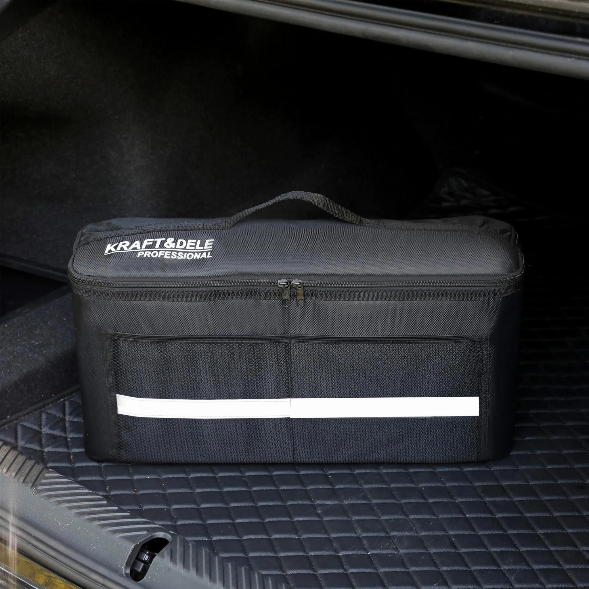 Organizer samochodowy KD11883 marki KRAFT&DELE to niezastąpiony element każdego samochodu, który pozwala utrzymać porządek w bagażniku. Dzięki zamkowi błyskawicznemu, organizer zabezpiecza przedmioty przed wypadaniem. Pojemne wnętrze pozwala na wygodne przechowywanie zakupów, narzędzi, akcesoriów samochodowych czy wyposażenia turystycznego.