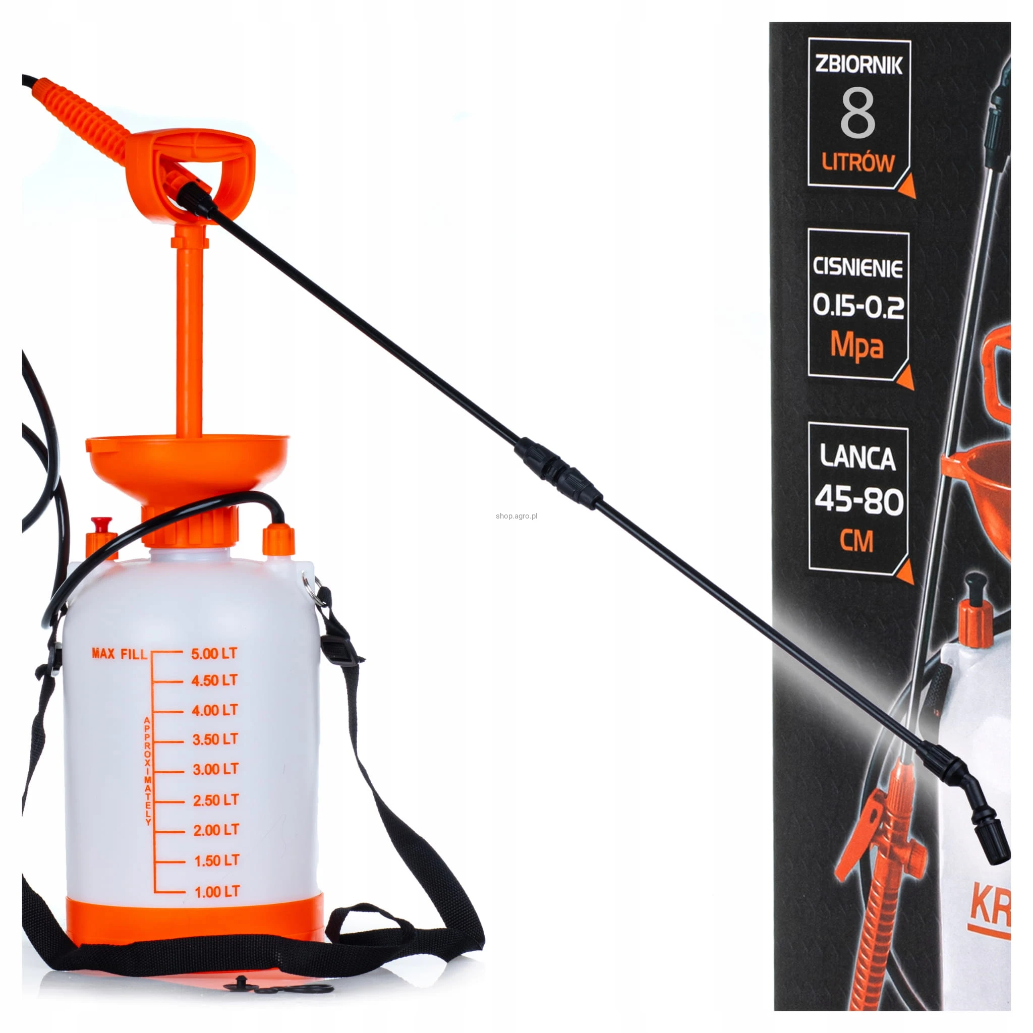 ✨ Posiada pojemność 8 litrów, co pozwala na wygodne dozowanie oraz efektywne pokrycie większych powierzchni w sadach, szklarniach czy na uprawach warzywnych.