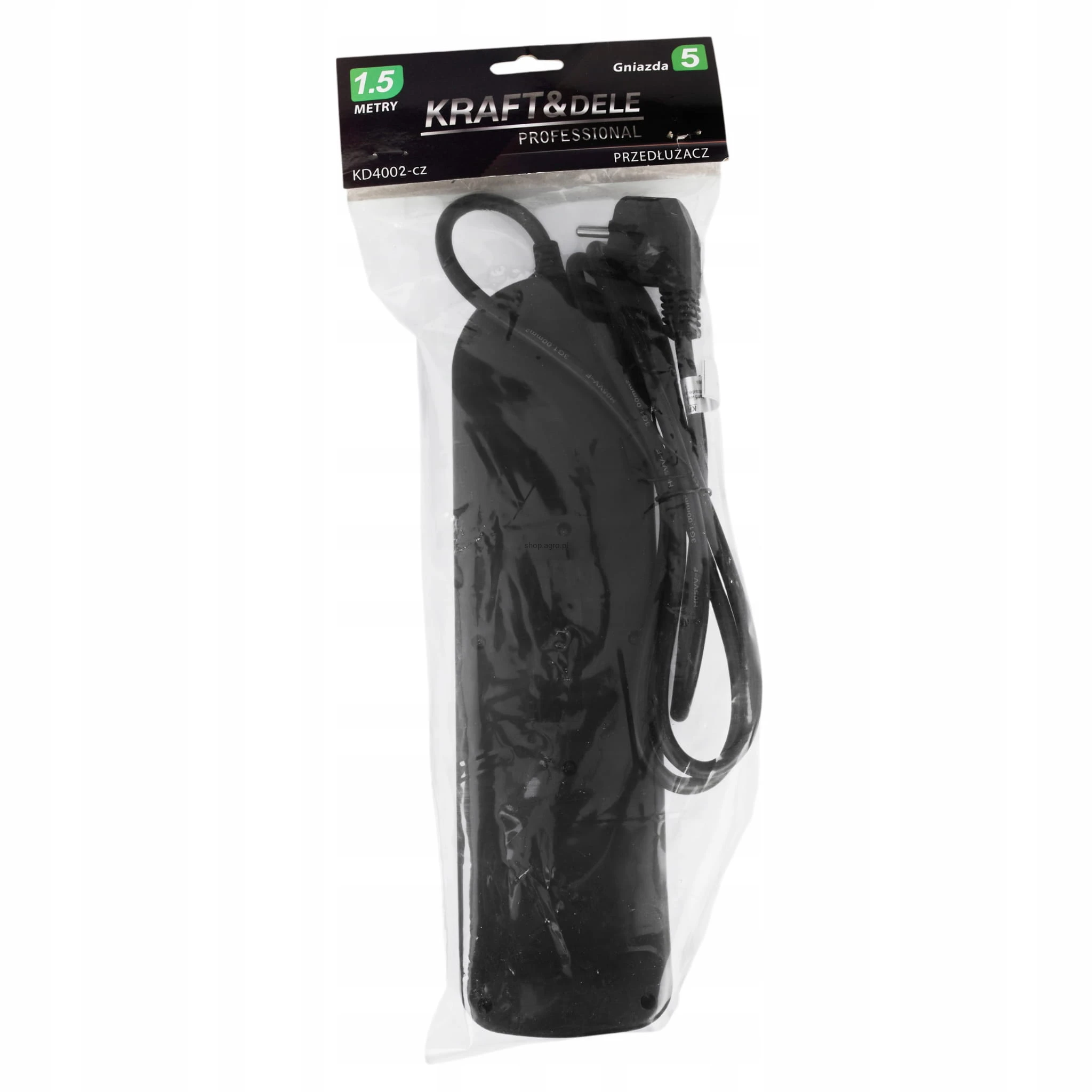 Przedłużacz sieciowy KRAFT&DELE w kolorze czarnym z pięcioma gniazdami przeznaczony do użytku domowego. Przedłużacz pozwala podłączyć urządzenia, które są oddalone od gniazda elektrycznego. Produkt z jednej strony posiada 5 gniazd obrócone pod kątem oraz włącznik, a z drugiej pojedynczy kątowy wtyk sieciowy.