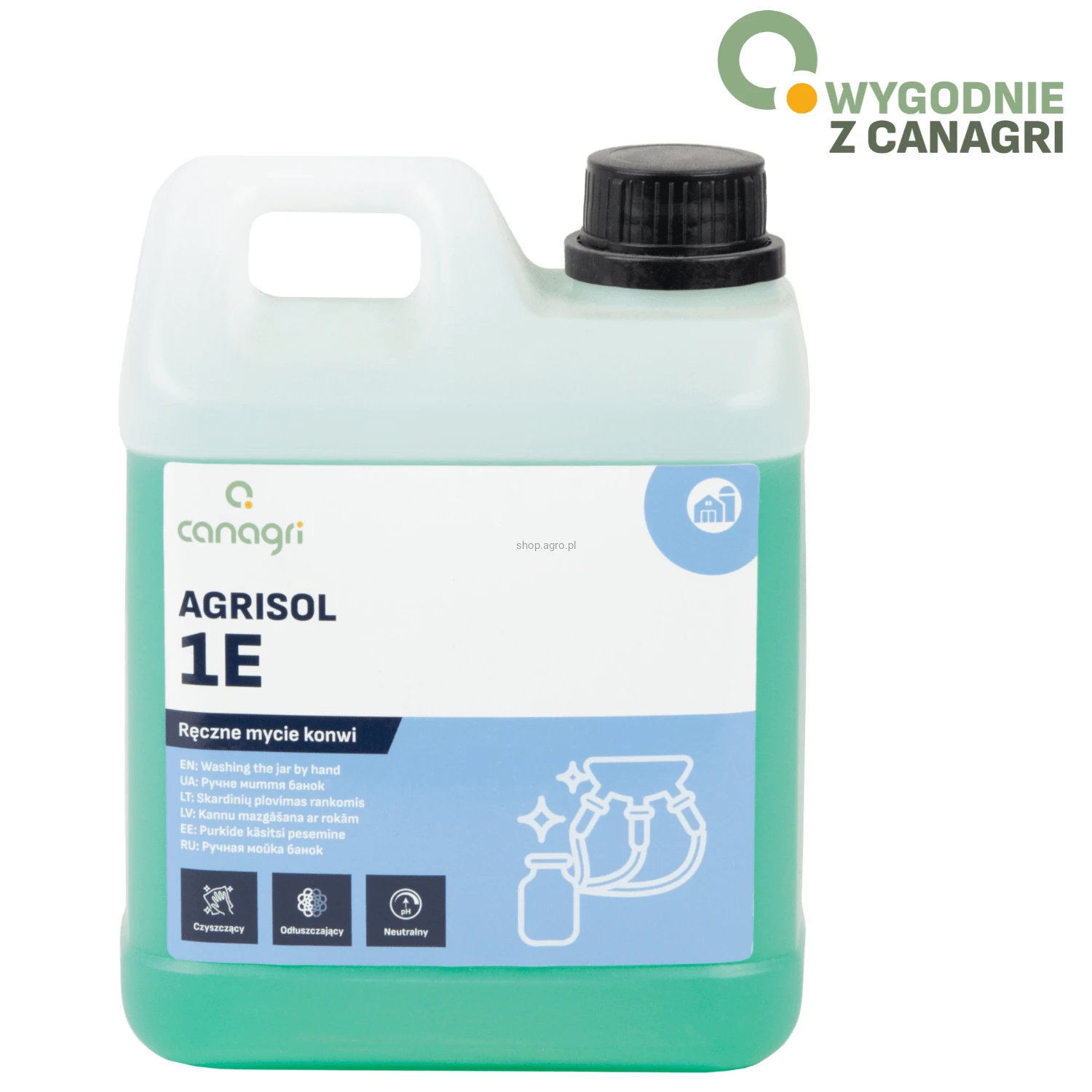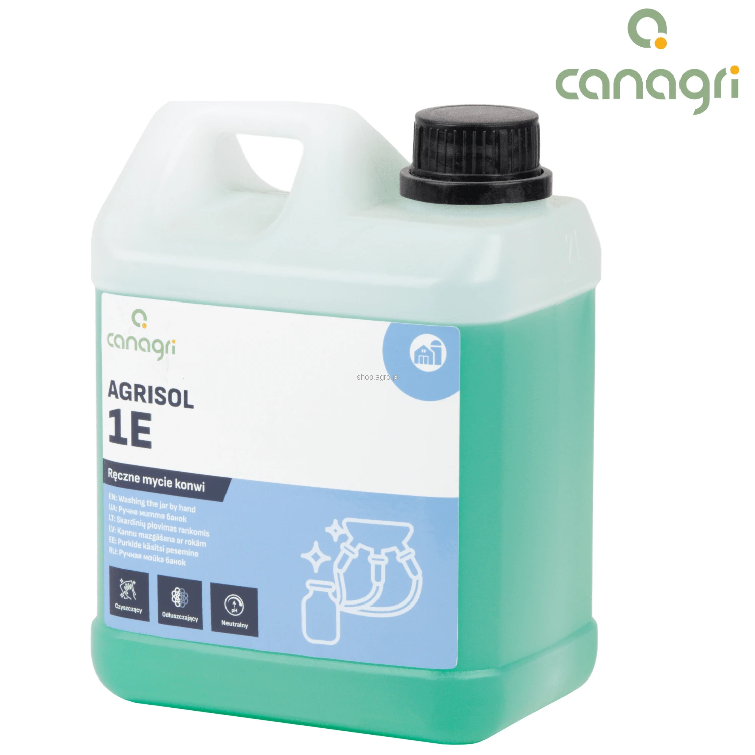 Agrisol 1 E - neutralny preparat myjący do ręcznego mycia konwi do mleka, schładzalników oraz pozostałych elementów dojarki mających kontakt z mlekiem.