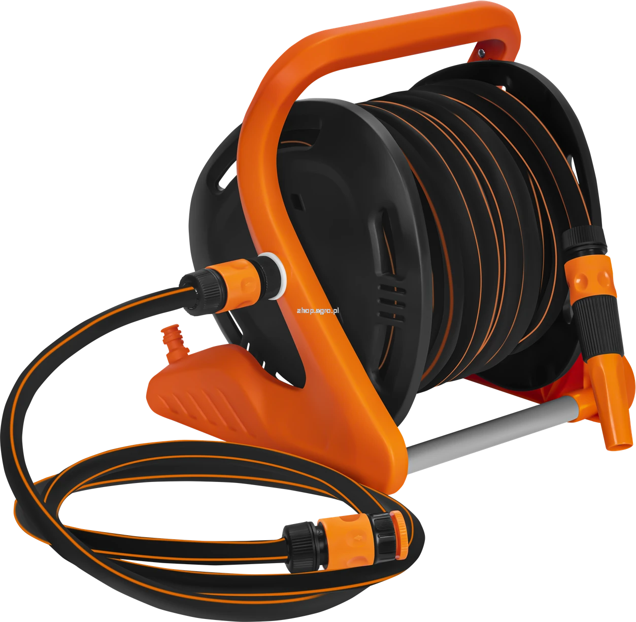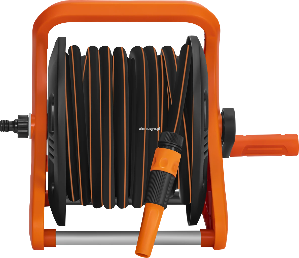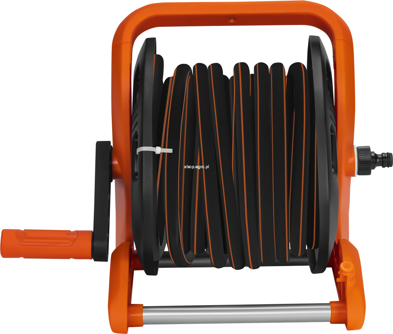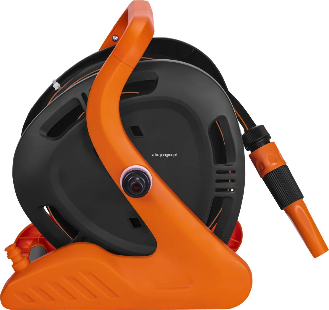 Konstrukcja stojaka zapewnia wysoką stabilność dzięki solidnym rurkom aluminiowym oraz nisko położonemu środkowi ciężkości. Ergonomiczny uchwyt ułatwia przenoszenie, a ręczna korbka umożliwia szybkie i wygodne zwijanie węża po zakończonej pracy. System zwijania zapobiega splątaniu i zaginaniu węża, co przekłada się na jego dłuższą żywotność. Całość została wykonana z materiałów odpornych na warunki atmosferyczne oraz promieniowanie UV, dzięki czemu stojak sprawdzi się podczas regularnego użytkowania w ogrodzie.