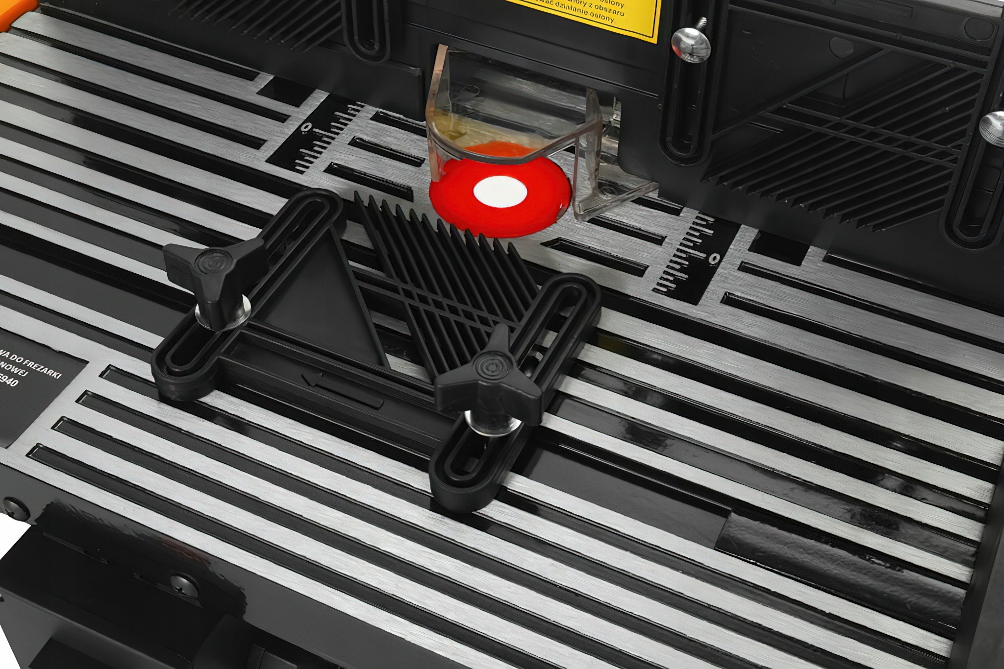 ✖️ Przykładnica frezująca wyposażona w zintegrowany odciąg wiórów. Podłączając odkurzacz do odciągu zapewniamy sobie czystą powierzchnię roboczą podczas pracy.