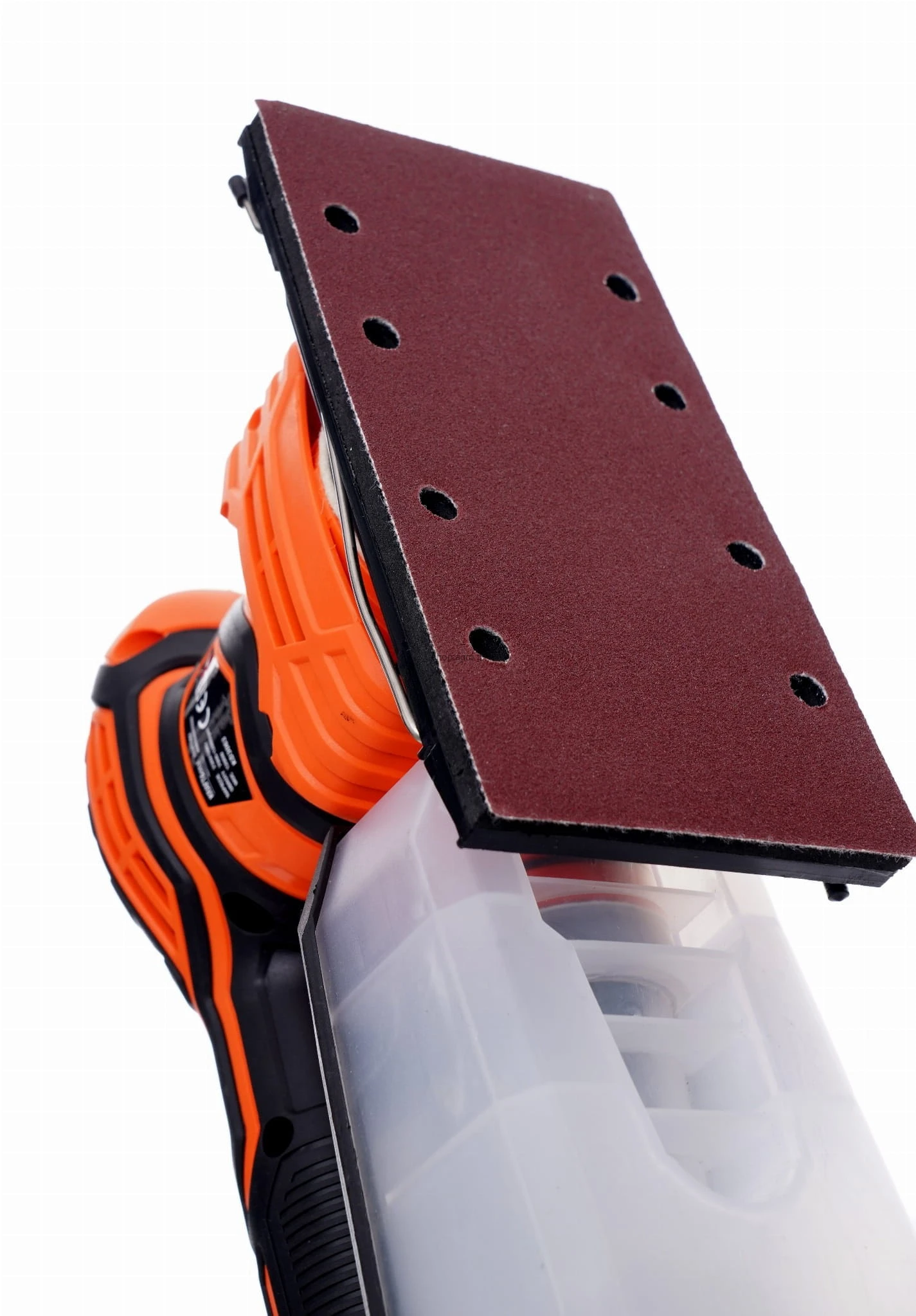 Wymiana papieru ściernego odbywa się bez narzędziowo, tarcze są mocowane na rzep. W zestawie znajduje się również worek na pył, dzięki czemu praca jest czysta.
