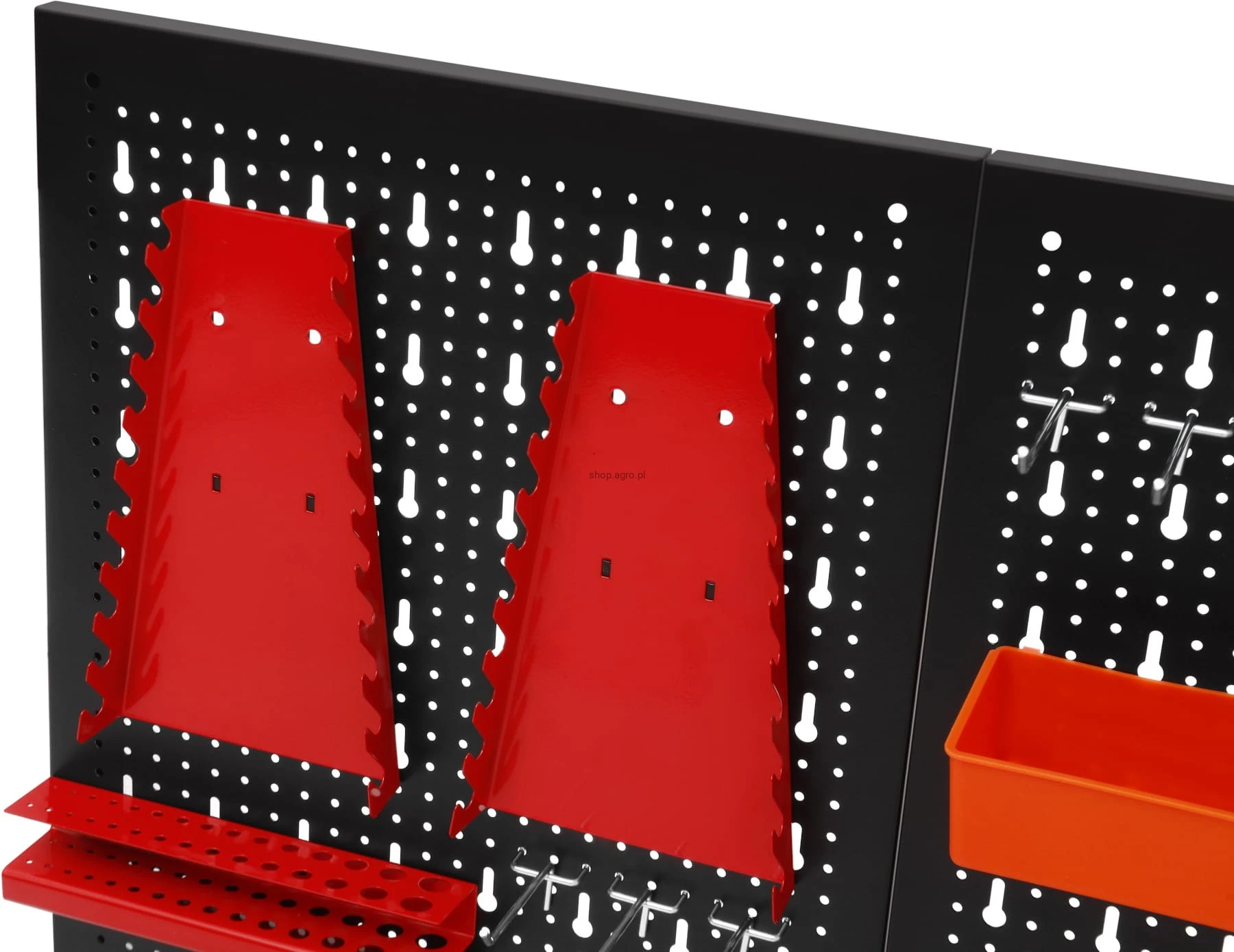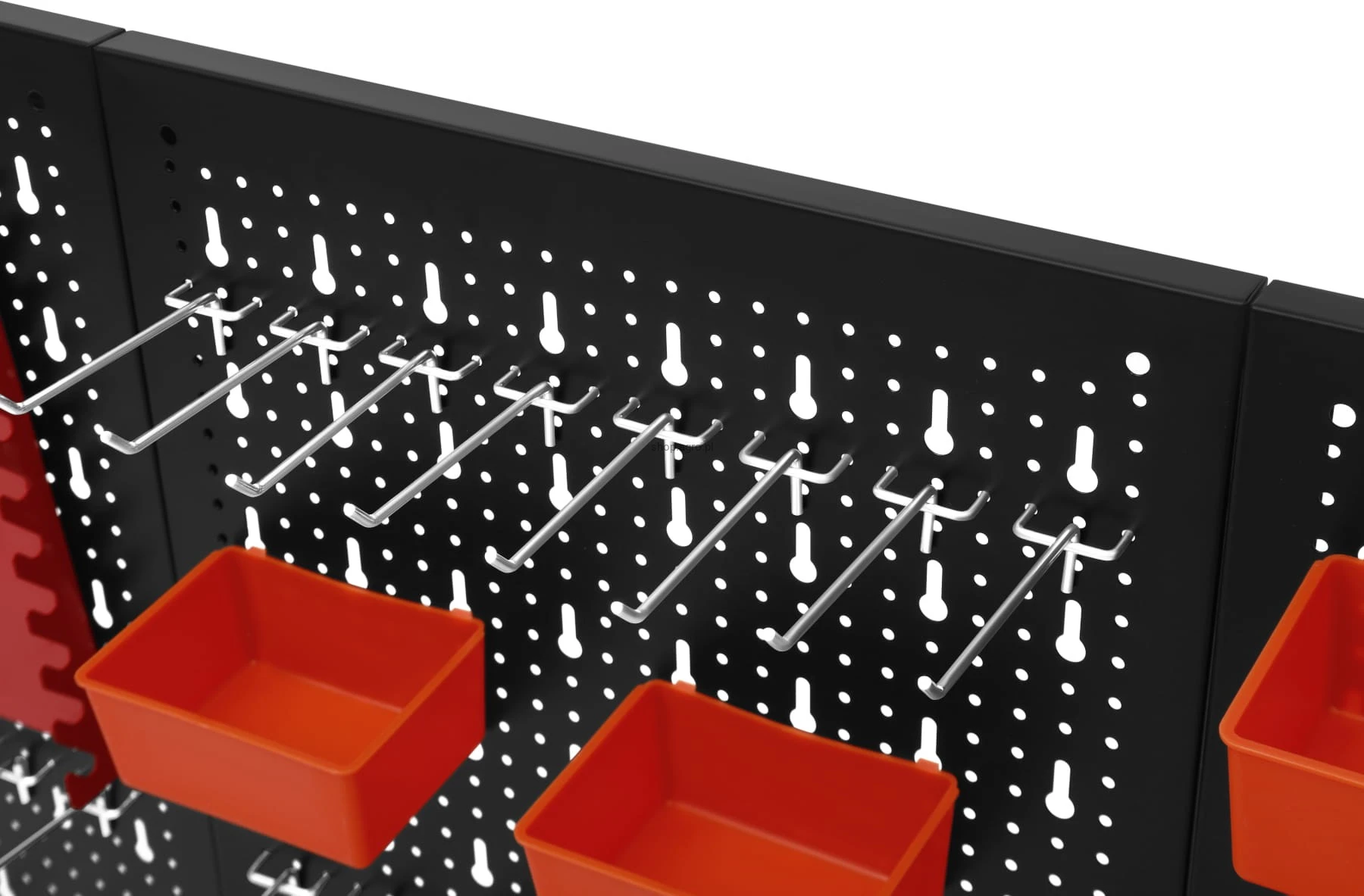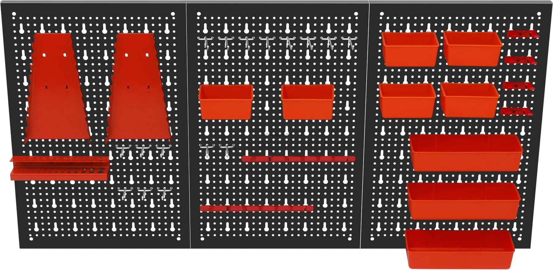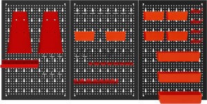 Metalowa konstrukcja zapewnia trwałość oraz stabilność, a perforowana powierzchnia umożliwia łatwy montaż wieszaków, haczyków i pojemników. Zestaw akcesoriów pozwala na praktyczną organizację narzędzi ręcznych, elementów montażowych oraz drobnych akcesoriów, zwiększając komfort pracy i utrzymanie porządku w miejscu roboczym.
