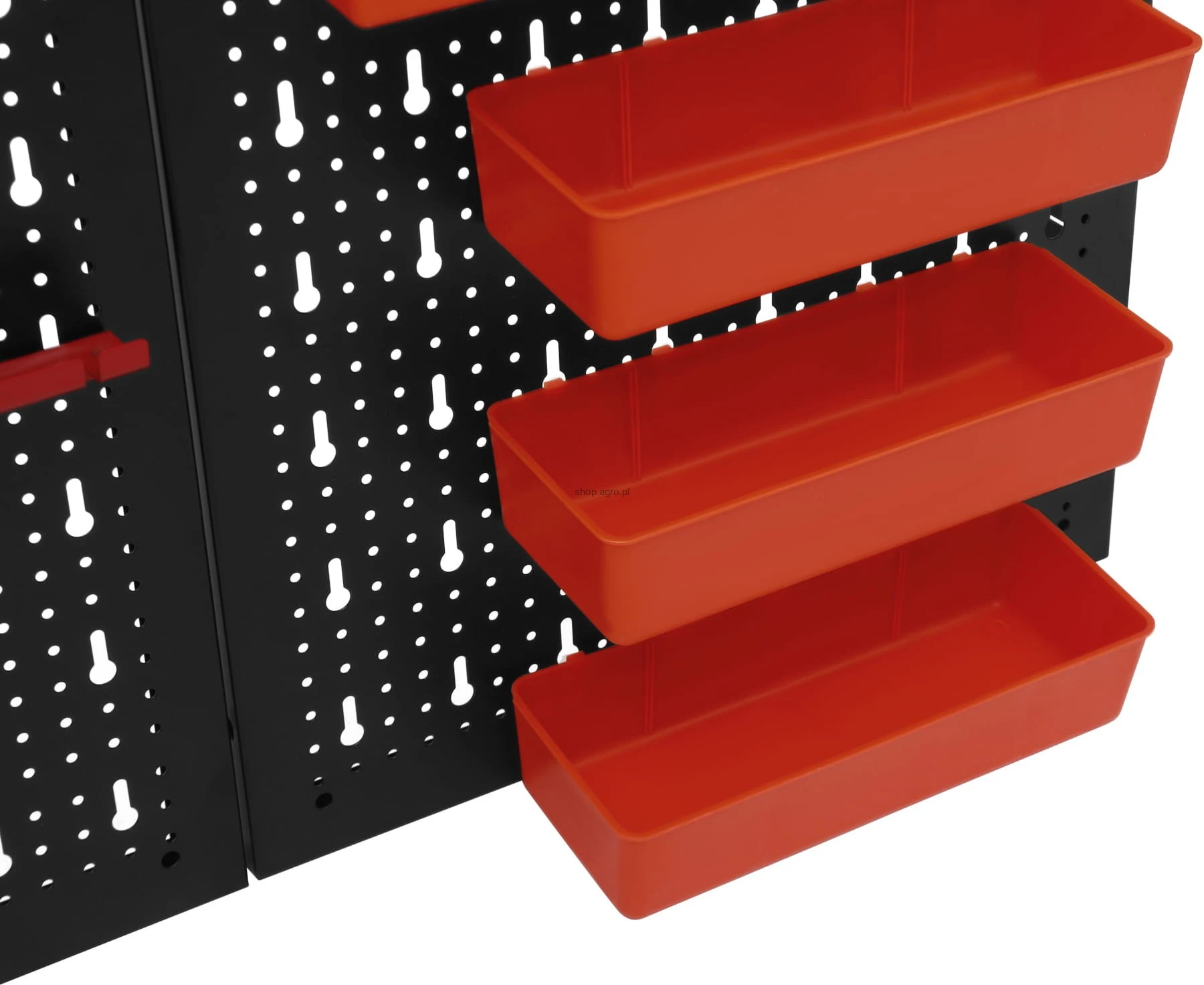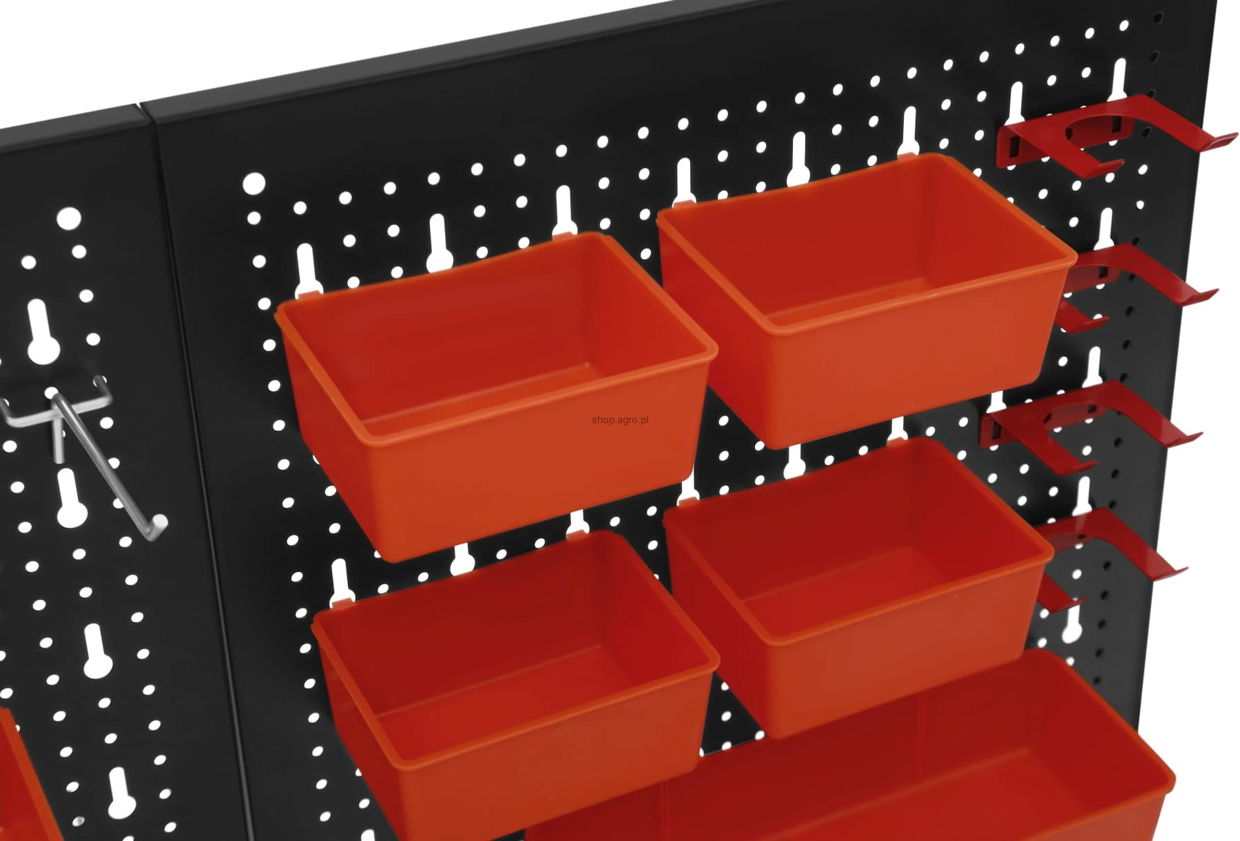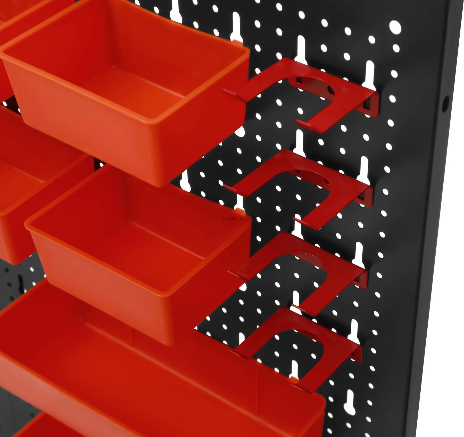 Metalowa konstrukcja zapewnia trwałość oraz stabilność, a perforowana powierzchnia umożliwia łatwy montaż wieszaków, haczyków i pojemników. Zestaw akcesoriów pozwala na praktyczną organizację narzędzi ręcznych, elementów montażowych oraz drobnych akcesoriów, zwiększając komfort pracy i utrzymanie porządku w miejscu roboczym.