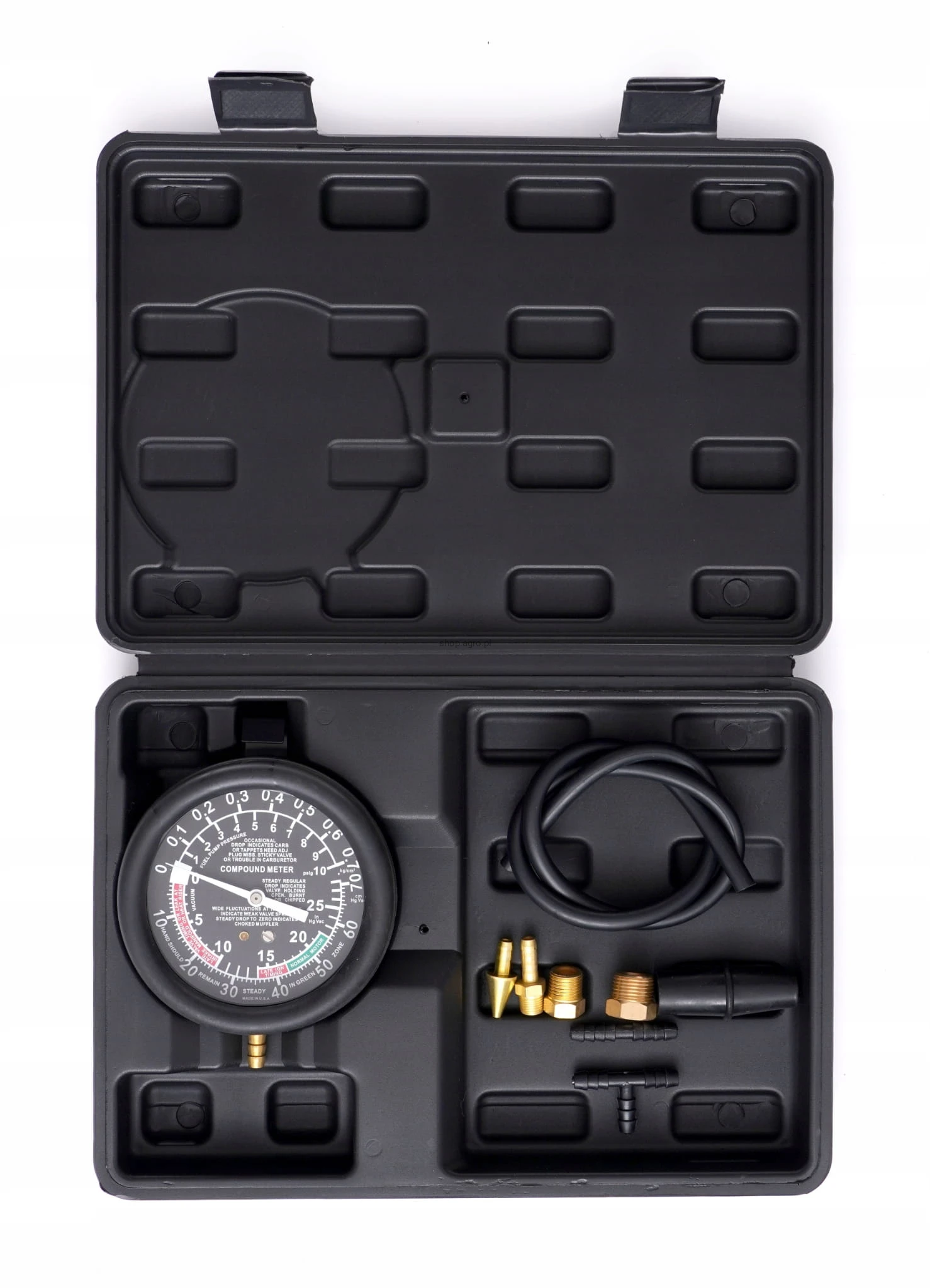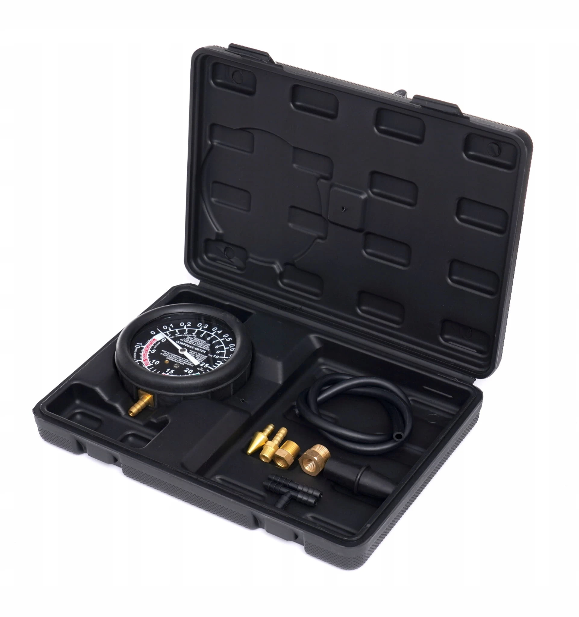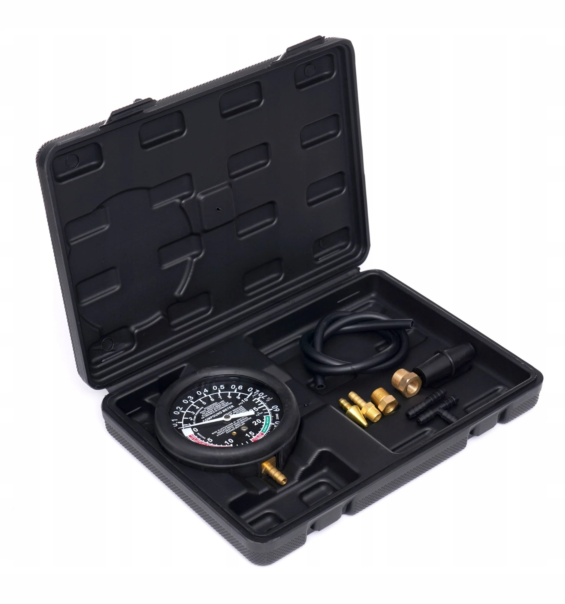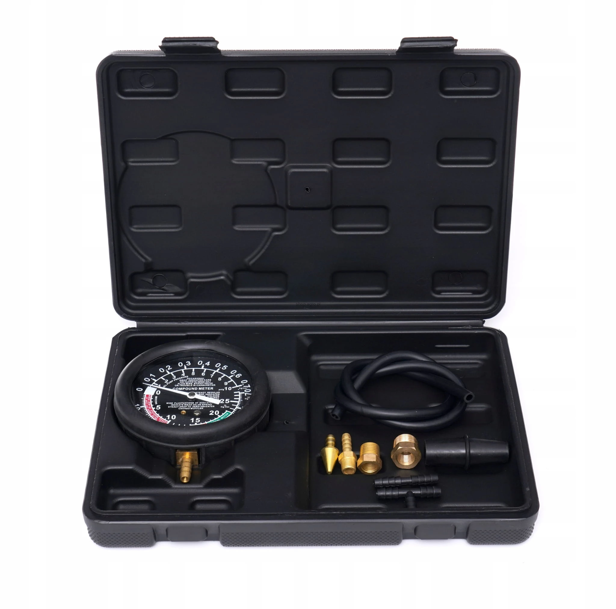 Zestaw przeznaczony do pomiaru ciśnienia w układach podciśnieniowych, gaźnikowych, kolektorach ssących. Wykorzystywany także do badania układów hamulcowych, zaworów selenoidowych, elektryczno-podciśnieniowych, wtryskiwaczy, elektrycznych i mechanicznych pomp paliwowych oraz diagnostyki zaworów.