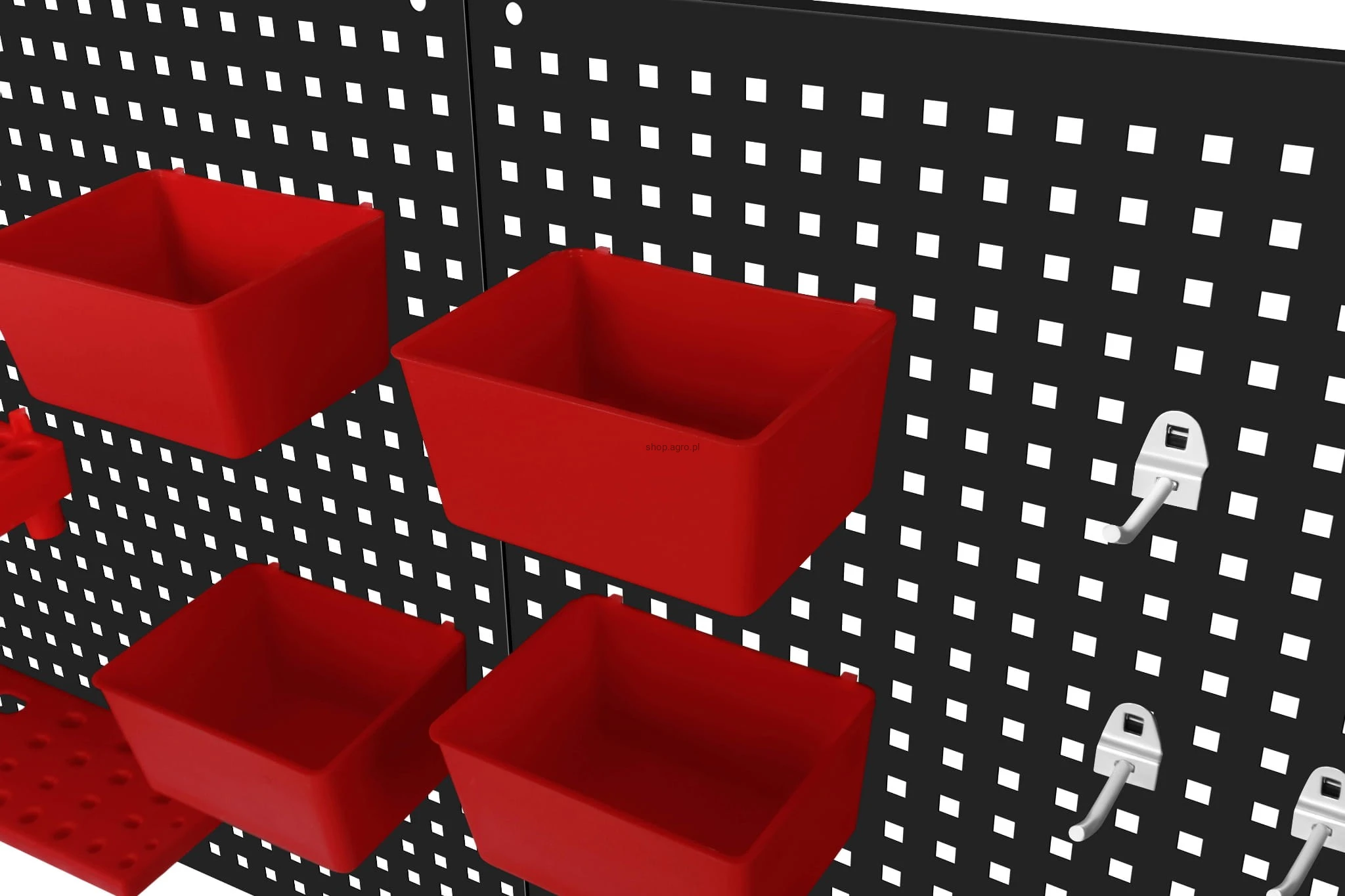 Dzięki metalowej konstrukcji z galwanizowanym wykończeniem tablica cechuje się wysoką odpornością na uszkodzenia i korozję. Przemyślany układ haczyków, uchwytów i pojemników pozwala na uporządkowanie narzędzi według własnych potrzeb, co znacząco zwiększa komfort i efektywność pracy. Łatwy montaż oraz dołączone elementy instalacyjne umożliwiają szybkie i stabilne zamocowanie tablicy na ścianie.