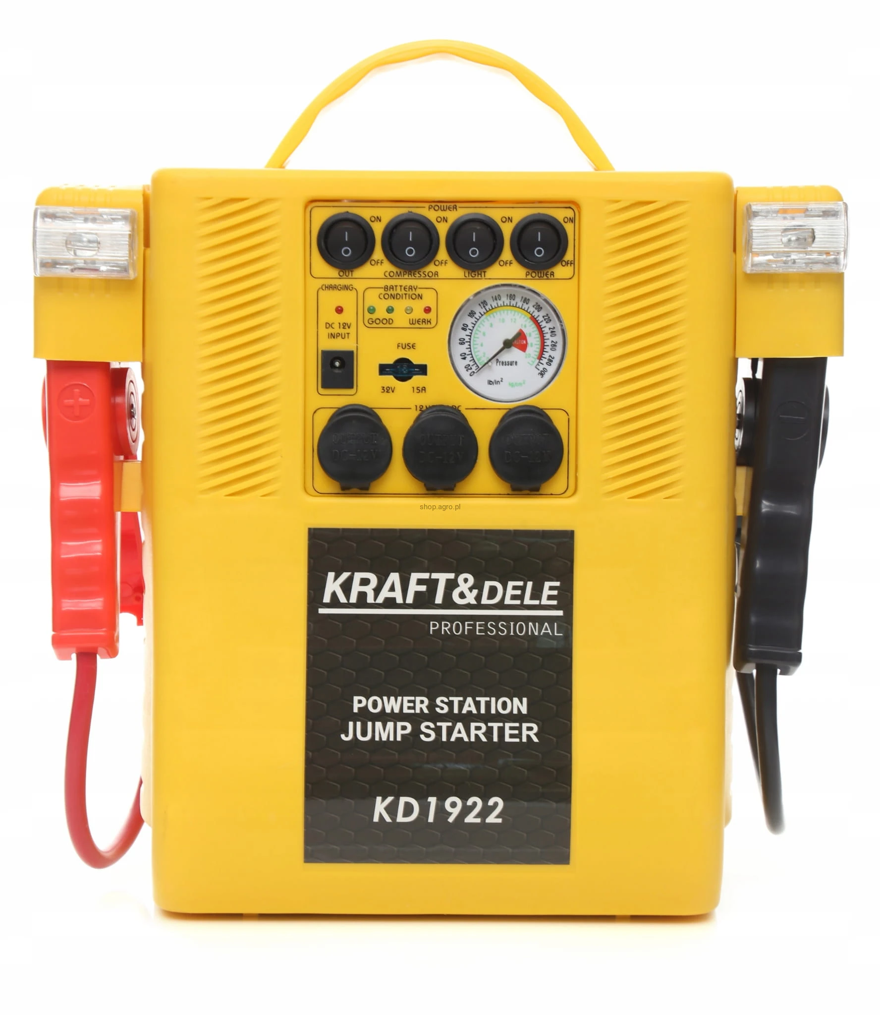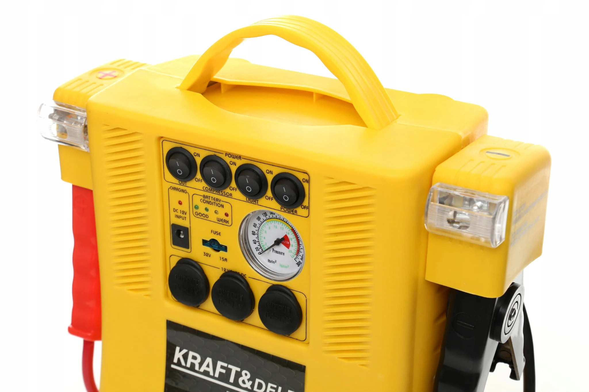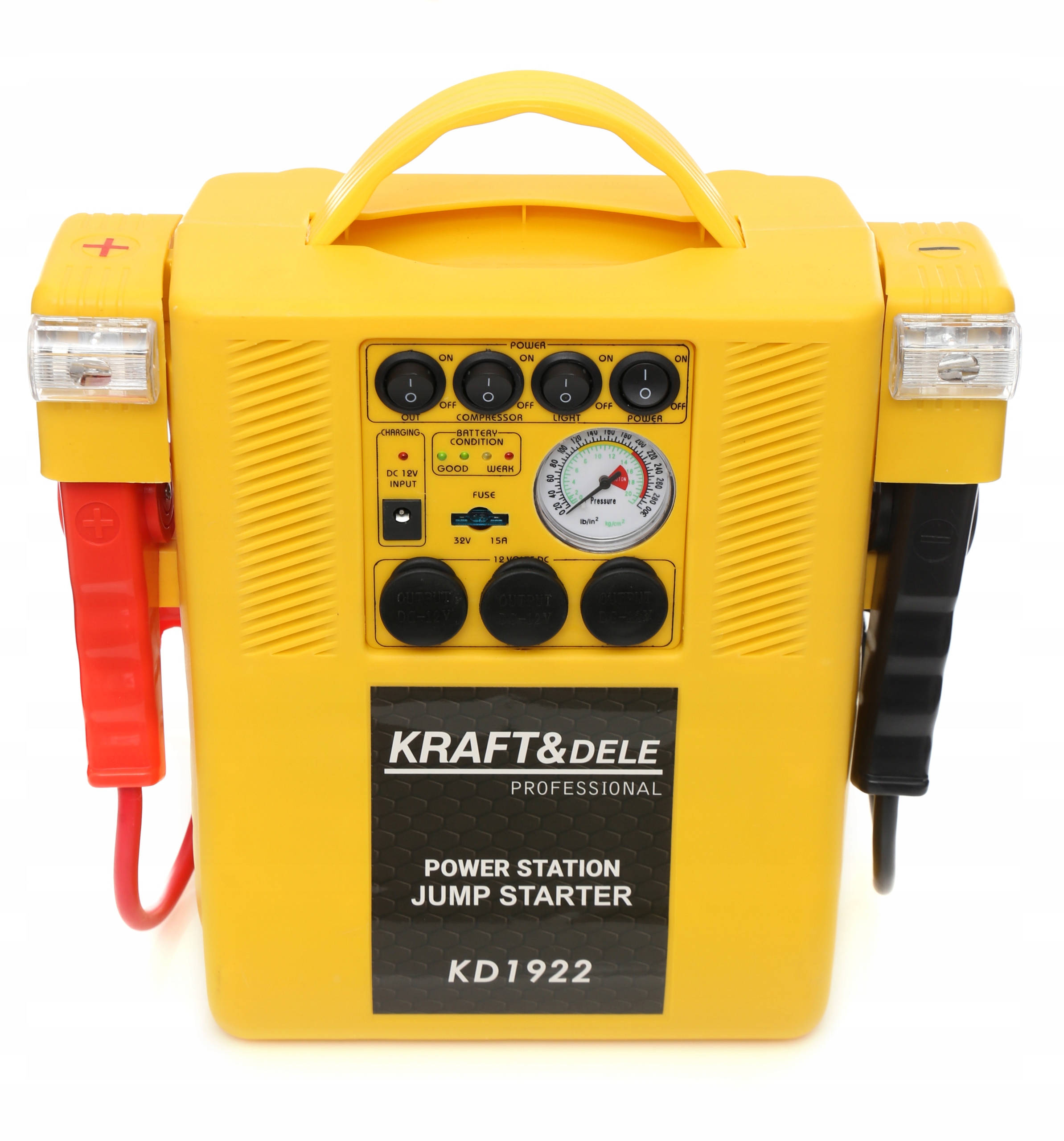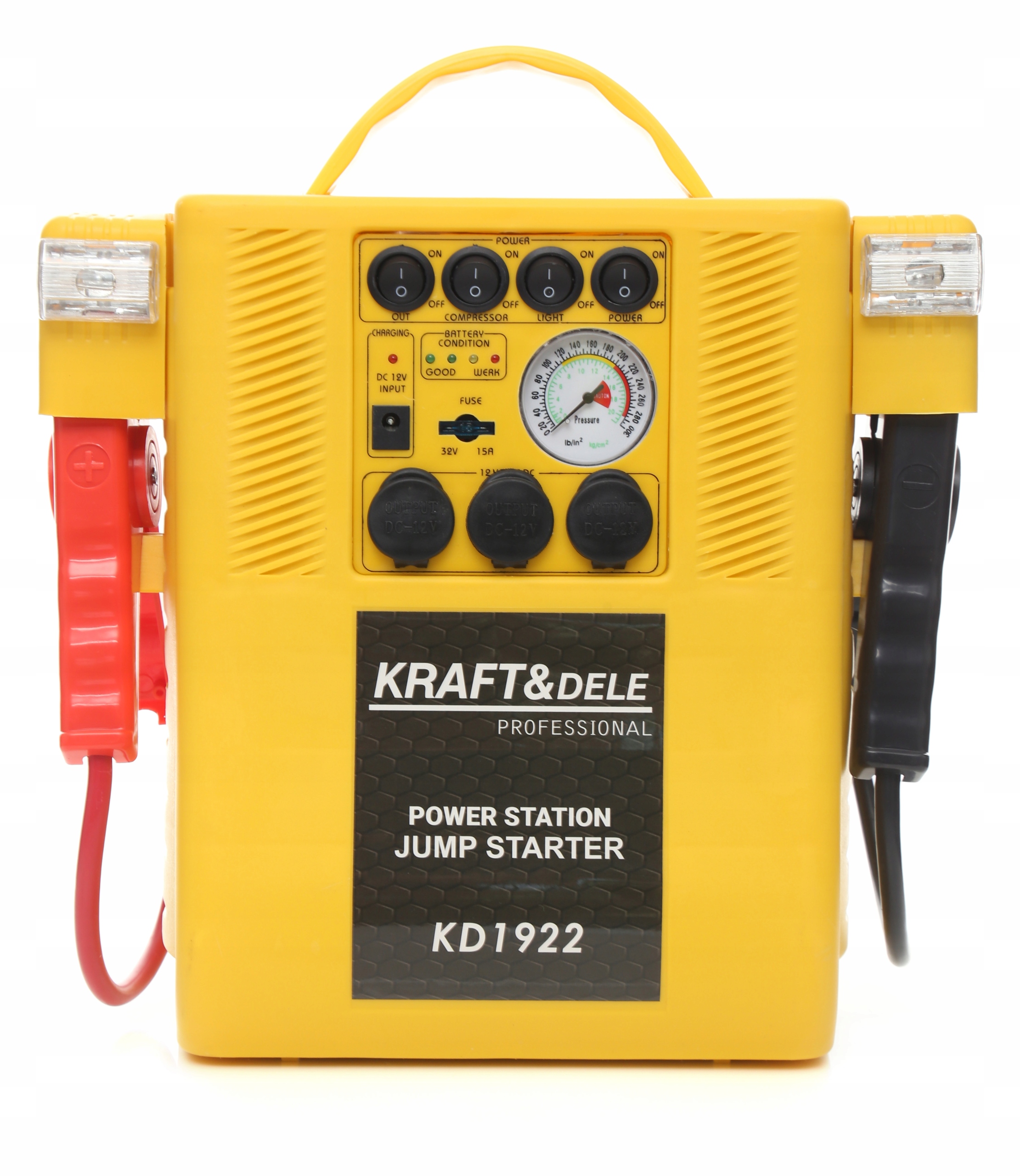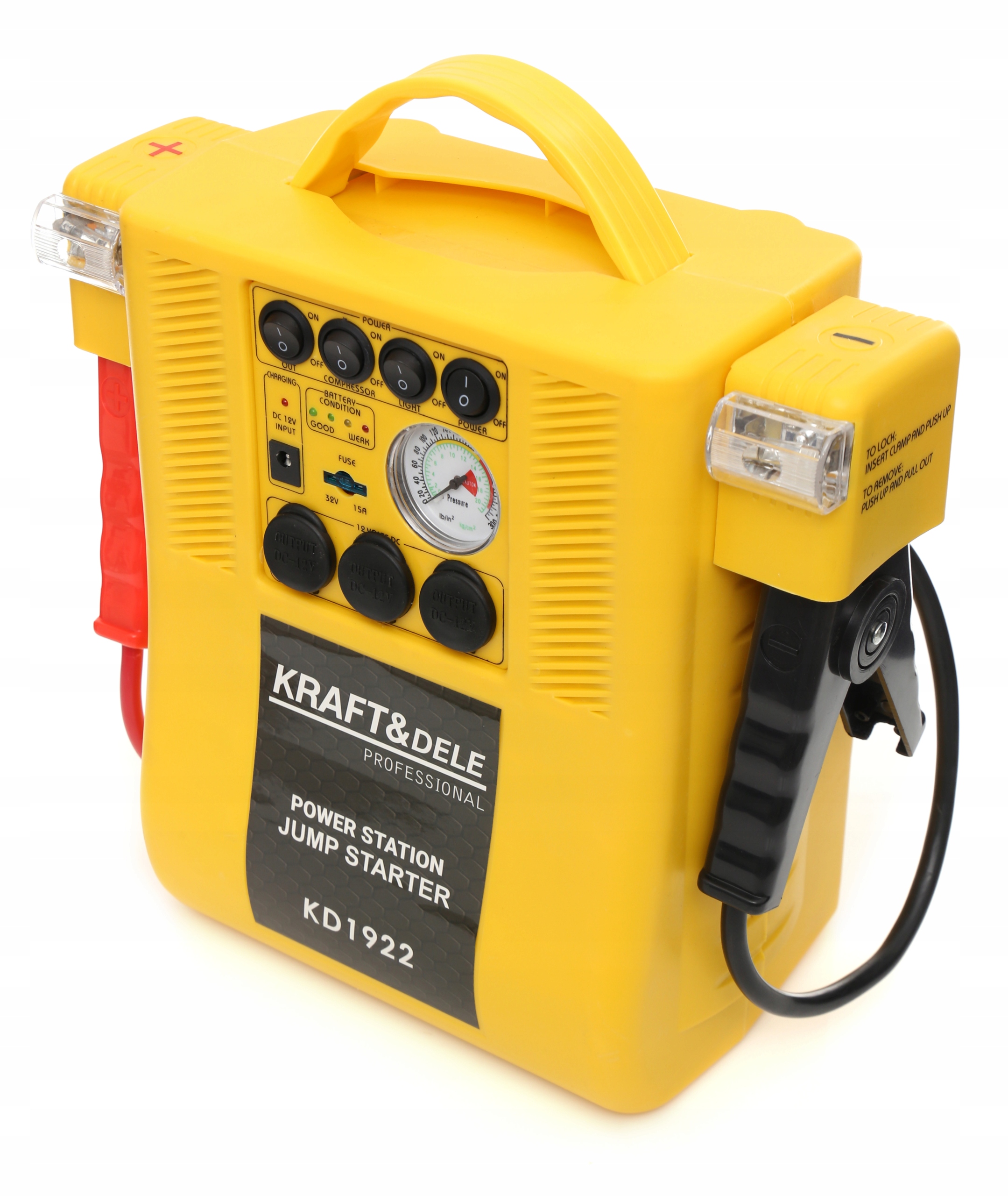 Urządzenie rozruchowe "Jump Starter" KRAFT&DELE to wszechstronne narzędzie, które łączy w sobie funkcje rozruchowe, kompresora, powerbanku oraz wielofunkcyjnej latarki.