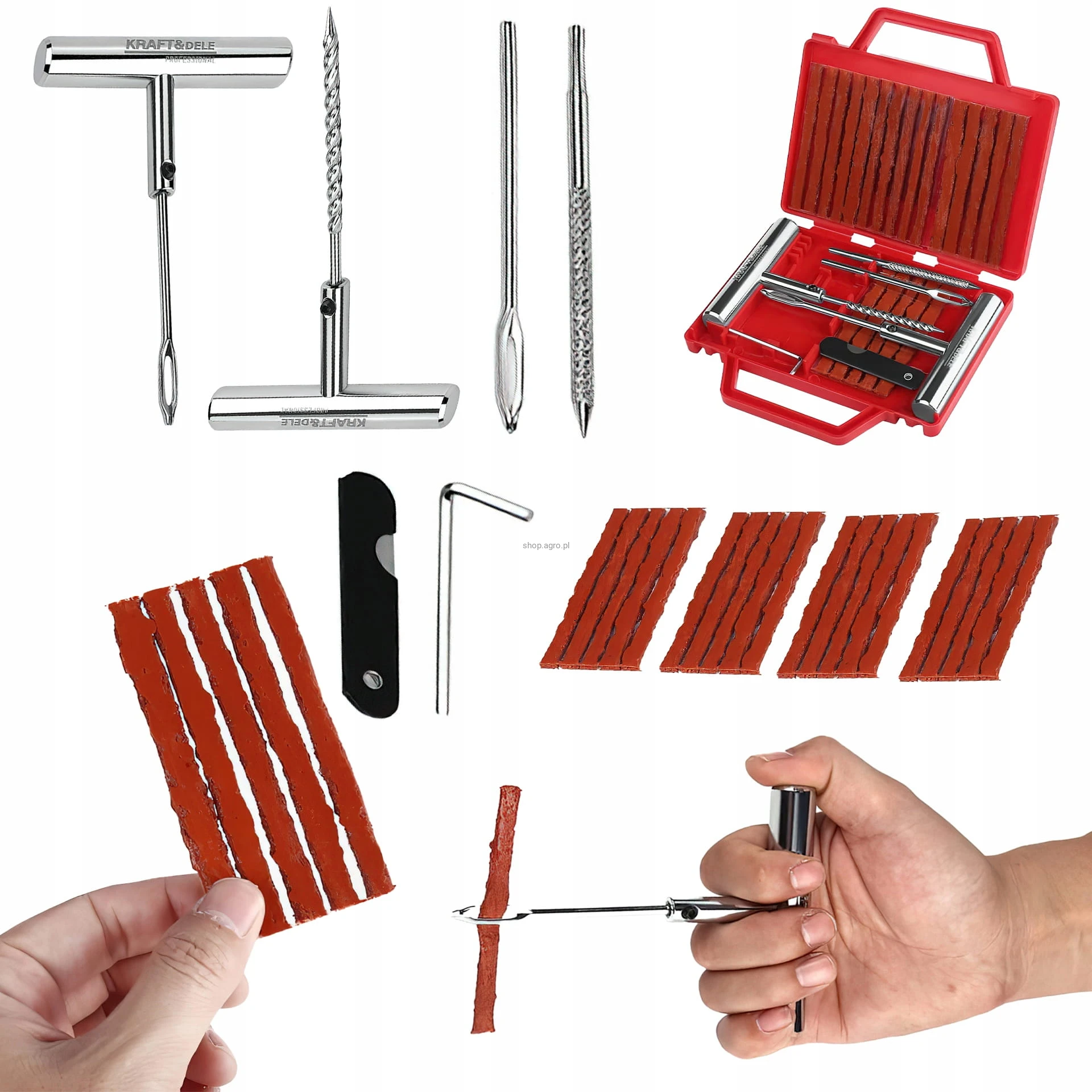 ✅ Typ narzędzi: spiralna sonda, wkrętaki, uchwyty, łatki, klej, paski naprawcze
