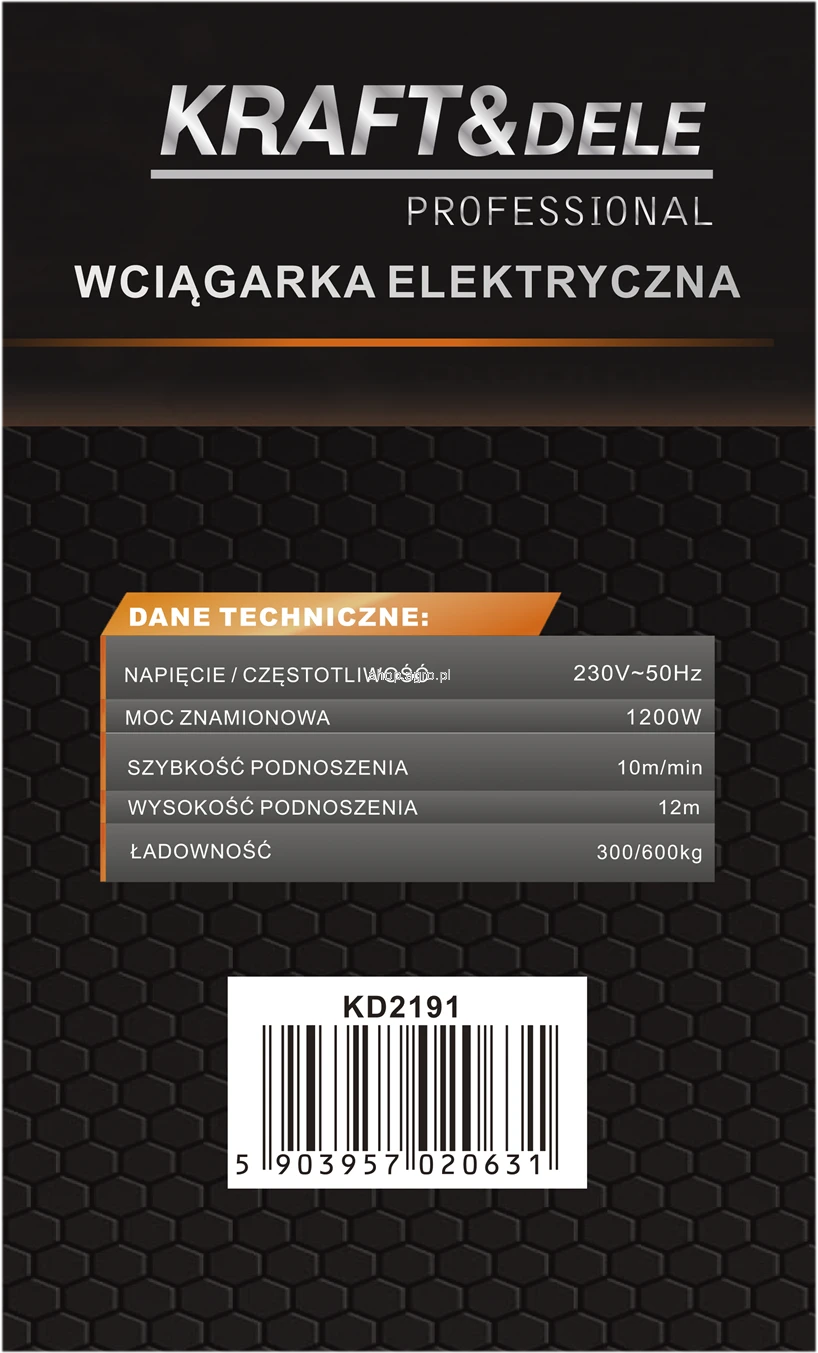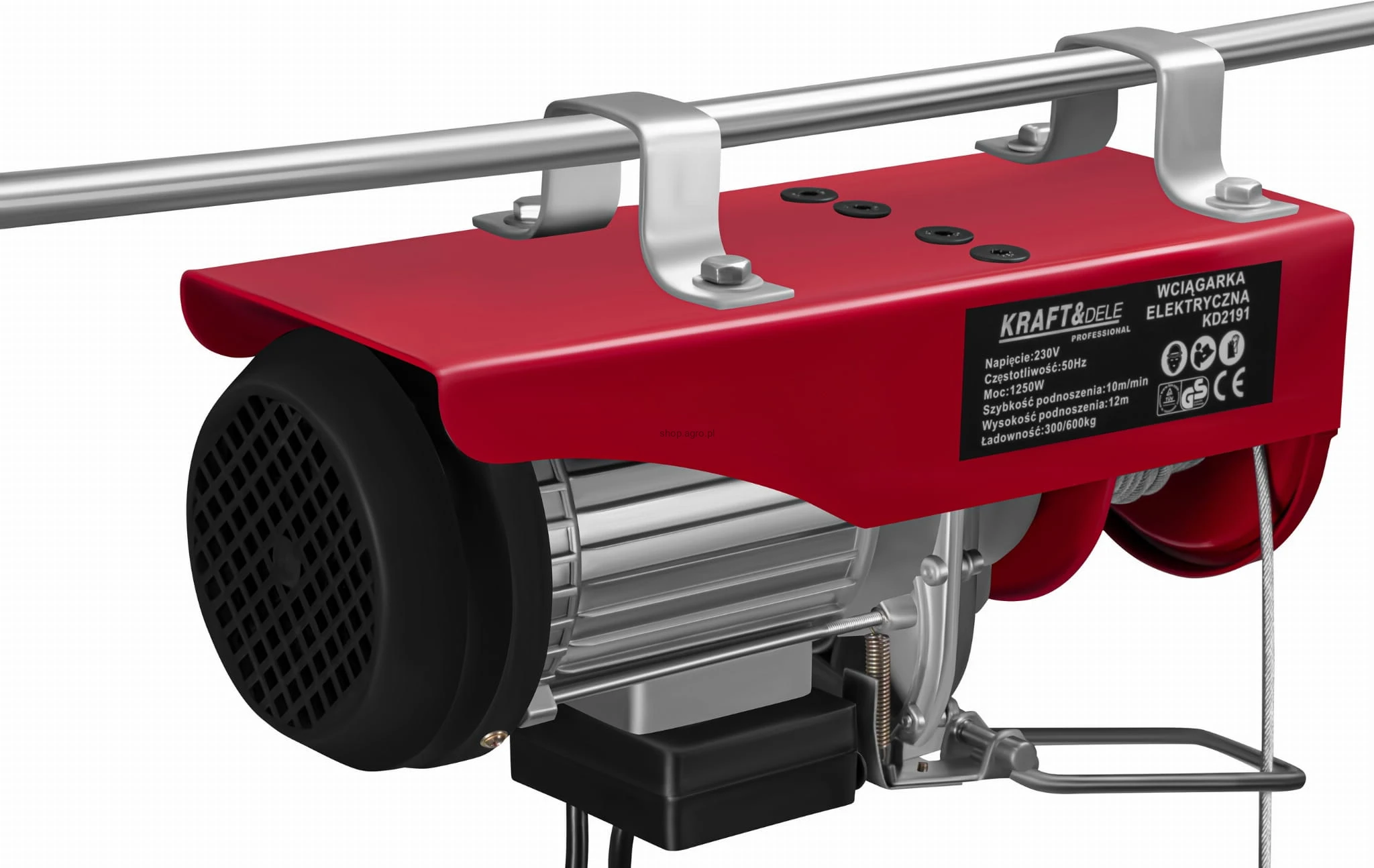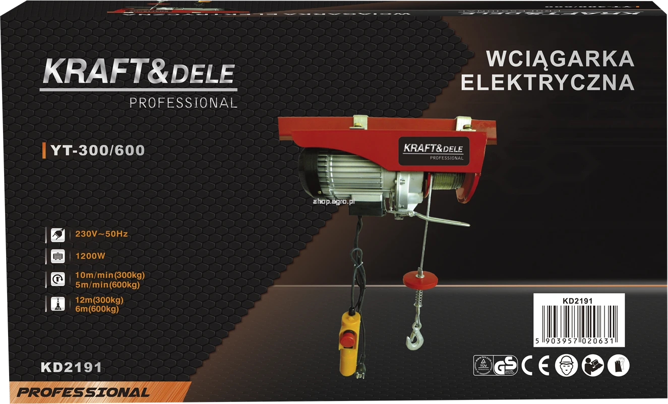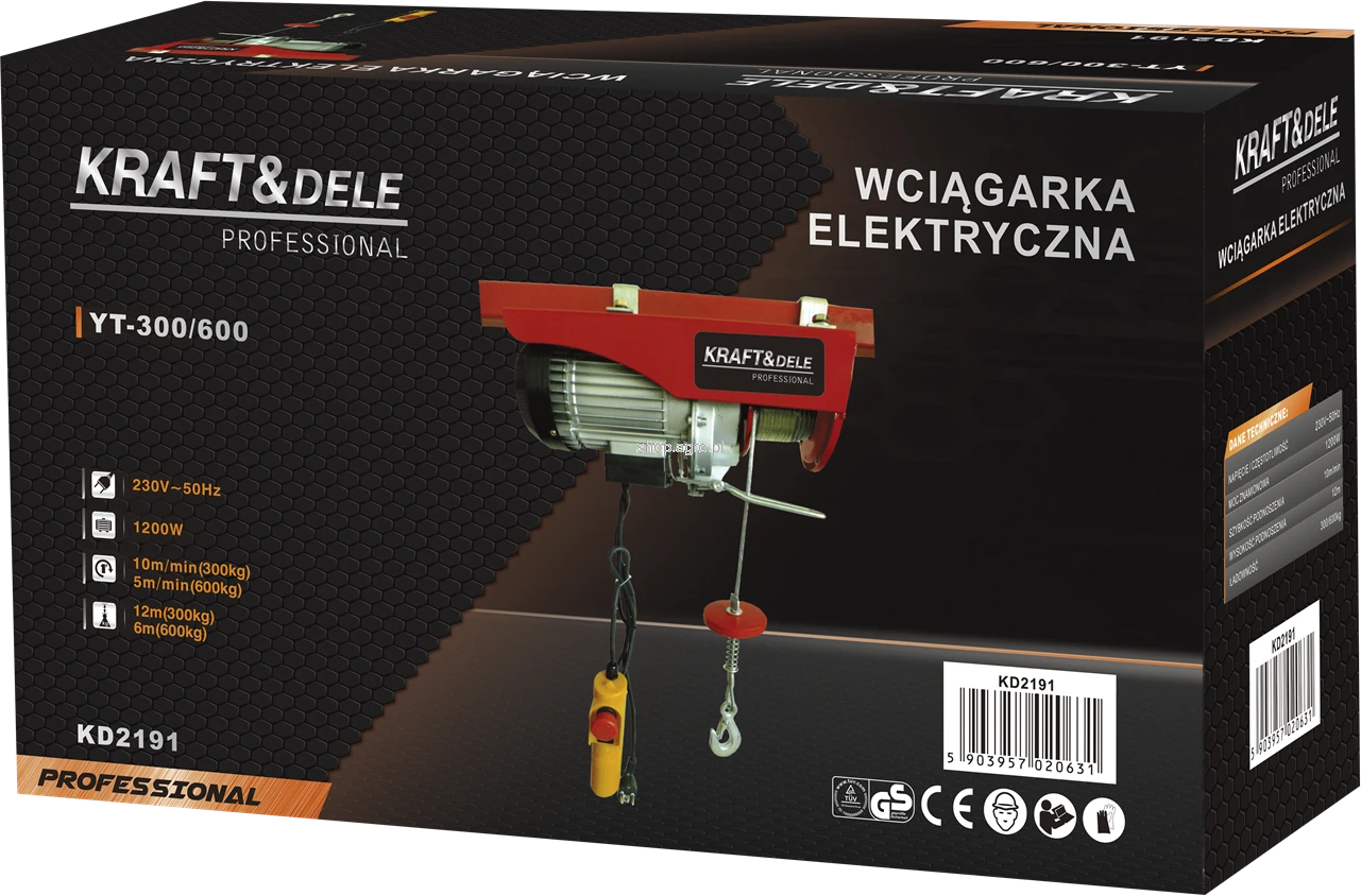 Wyciągarka elektryczna; wciągarka elektryczna 230V; wyciągarka 1200W; wciągarka 300kg; wciągarka 600kg; wyciągarka warsztatowa; wyciągarka na budowę; wyciągarka KRAFT&DELE KD2191;
