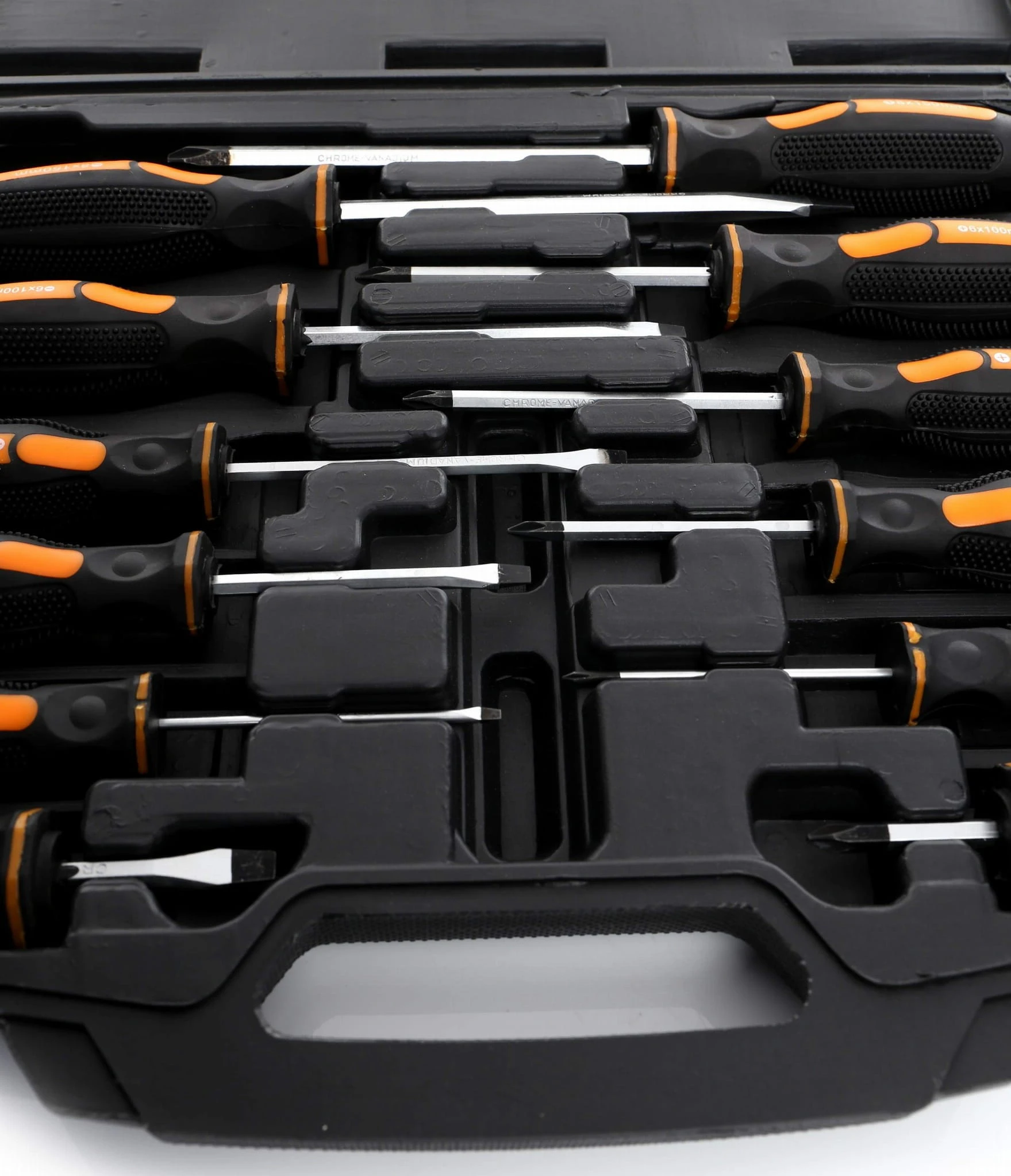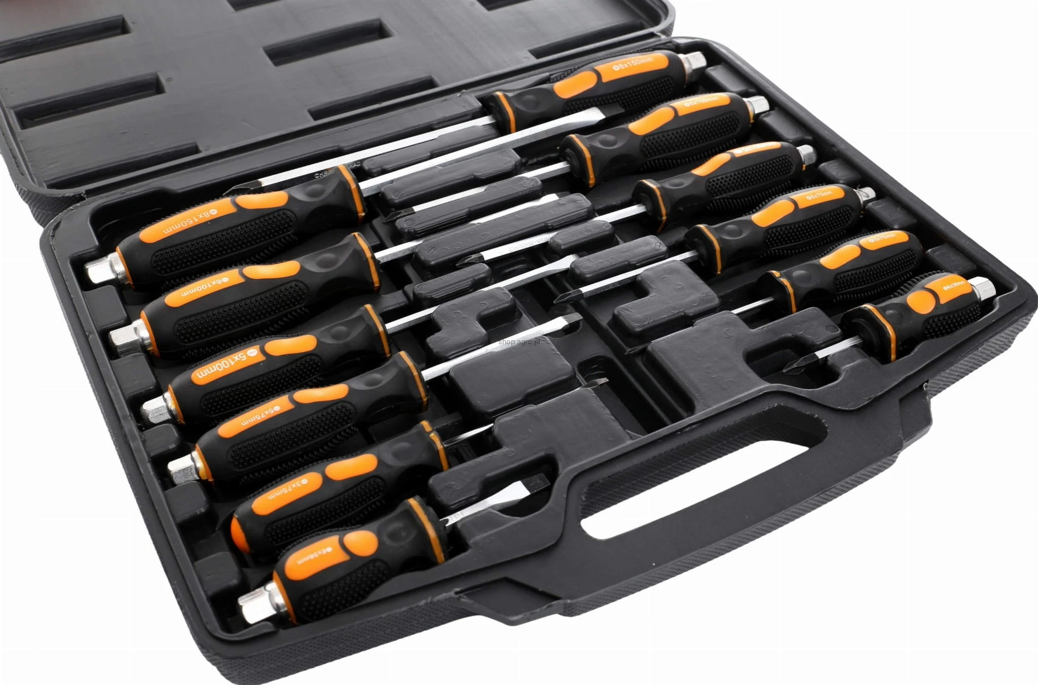 Model KD10284 został wyposażony w przelotowy trzpień przechodzący przez rękojeść, co pozwala na pobijanie wkrętaków oraz skuteczne przenoszenie siły uderzenia. Dodatkowy zabierak sześciokątny umożliwia wspomaganie pracy kluczem, zwiększając moment obrotowy. Wkrętaki wykonano ze stali CrV, a końcówki zostały dodatkowo utwardzone, co przekłada się na wysoką trwałość i odporność na intensywne użytkowanie. Magnetyczne końcówki ułatwiają przytrzymanie śrub, a antypoślizgowe rękojeści poprawiają komfort i pewność chwytu. Całość umieszczono w wytrzymałej walizce, która ułatwia transport i przechowywanie zestawu.