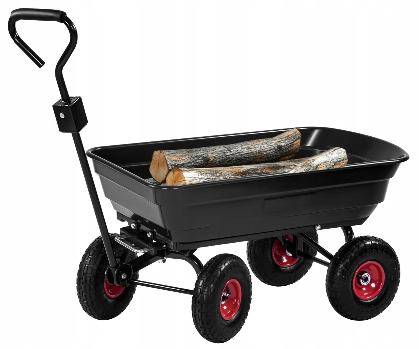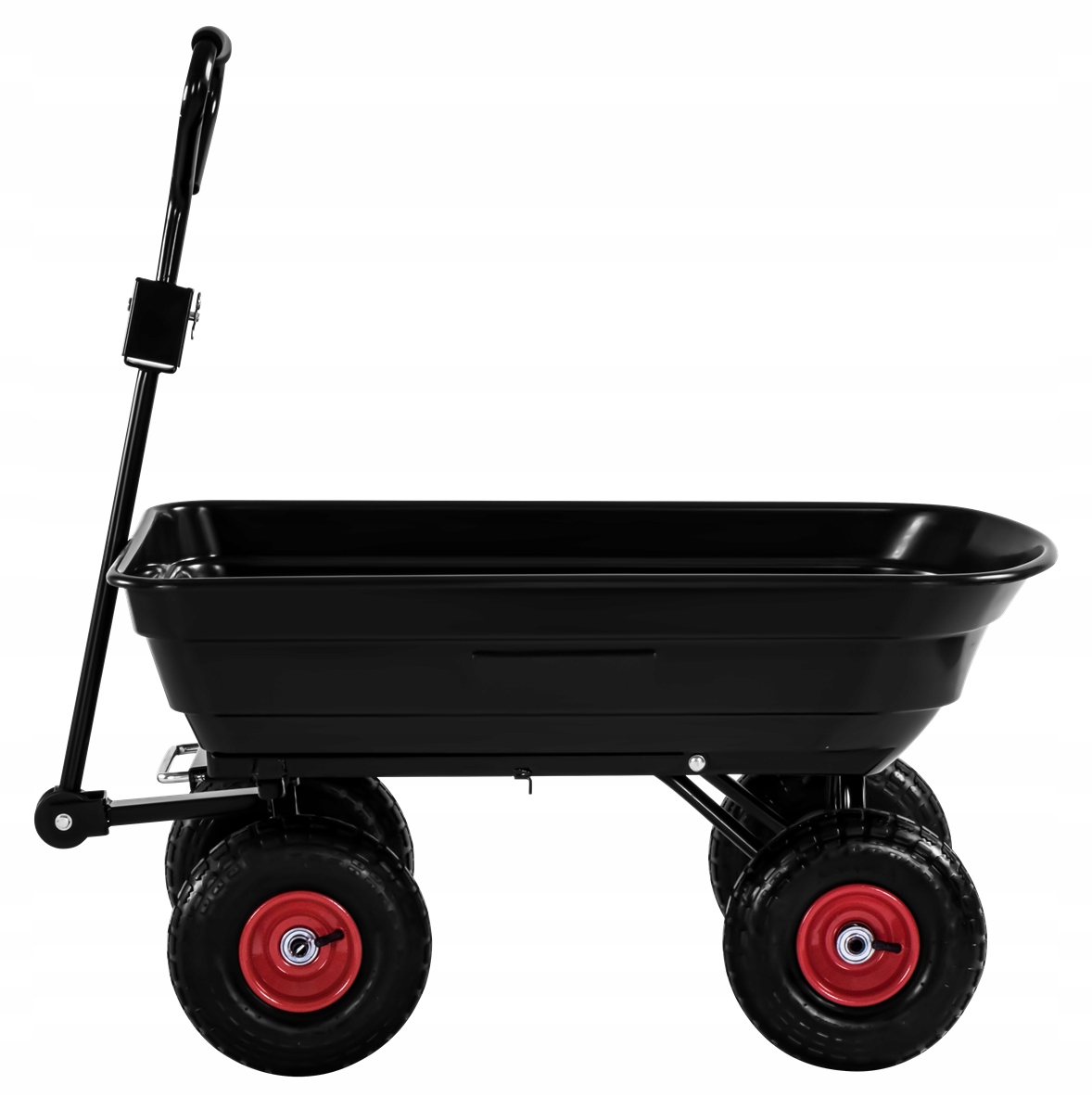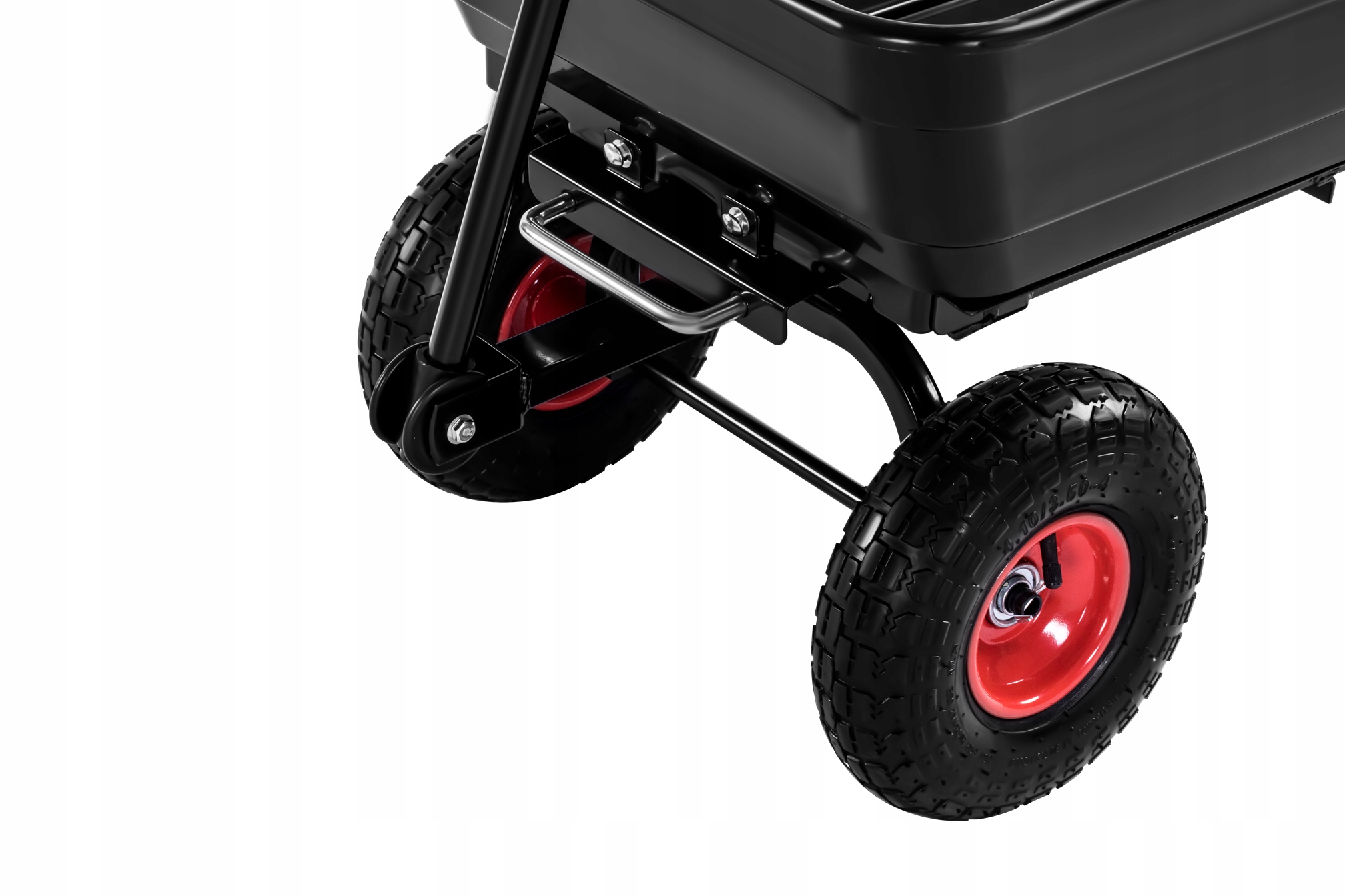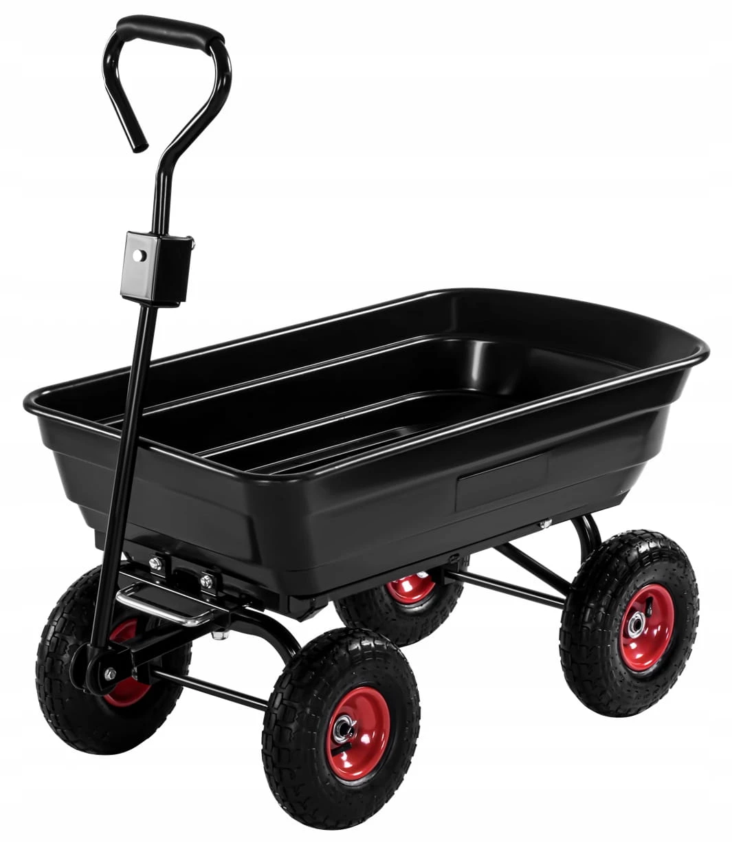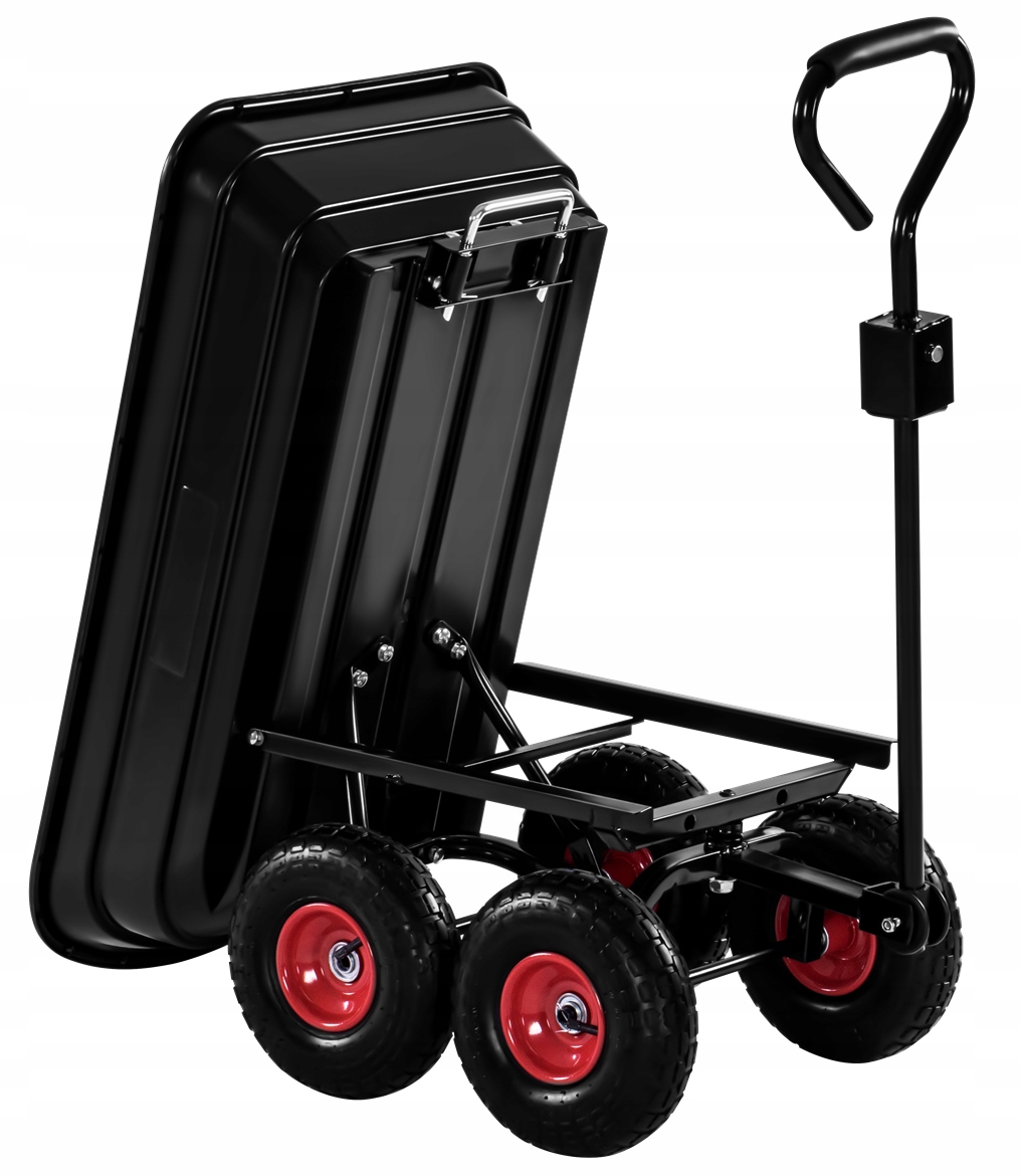➡️ Obrotowa oś przednia i duże opony pneumatyczne umożliwiają płynne prowadzenie wózka transportowego po różnych nawierzchniach, takich jak trawa, żwir, błoto i asfalt.