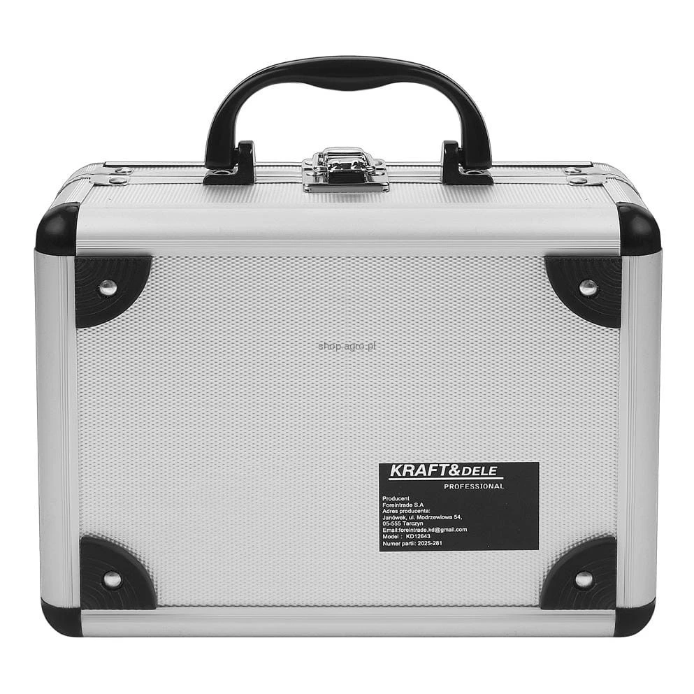 Elementy zestawu zostały starannie zapakowane w solidną walizkę z uchwytem do przenoszenia i zamykaną klamrą, co ułatwia organizację narzędzi i ich bezpieczne przechowywanie.