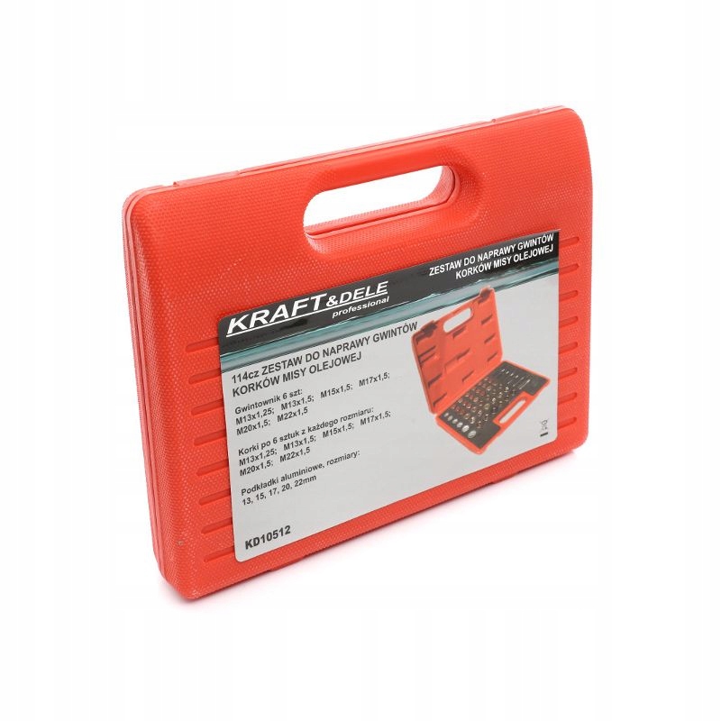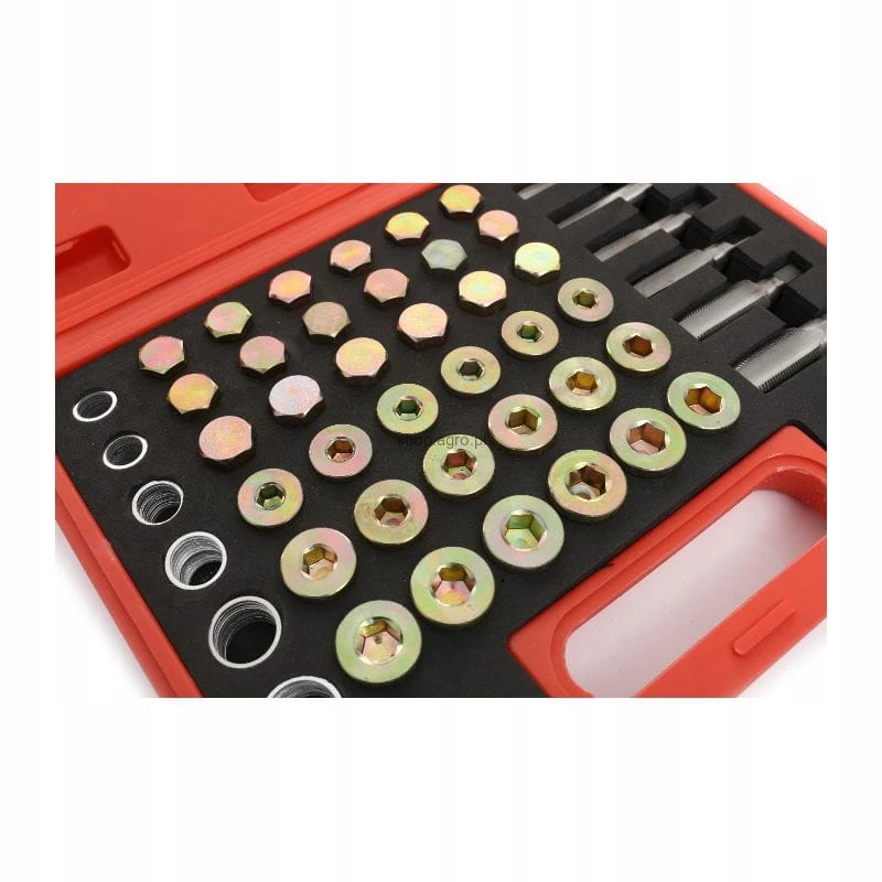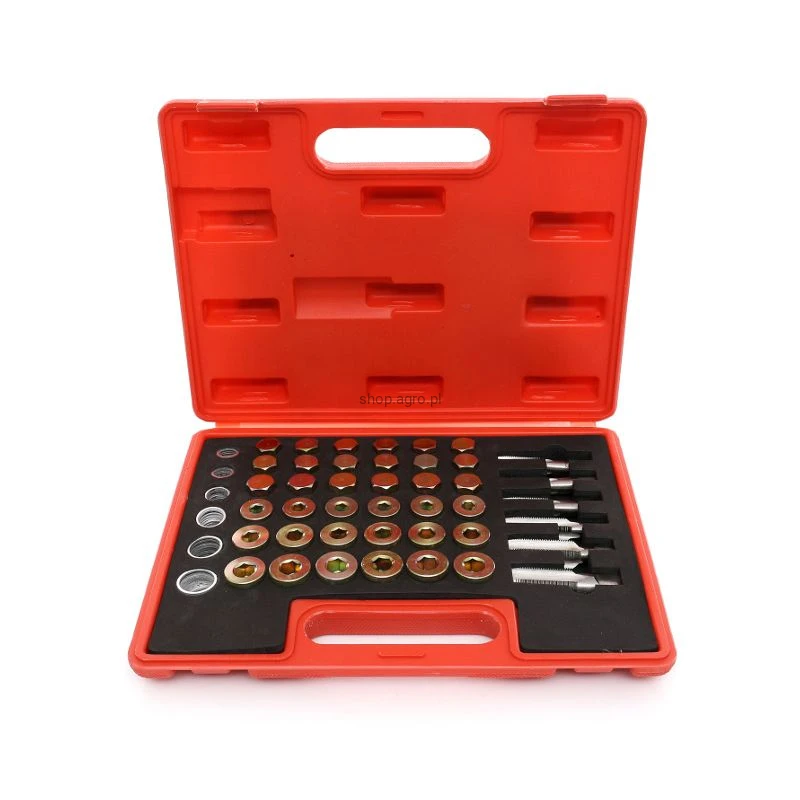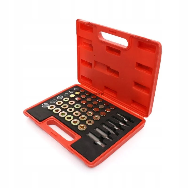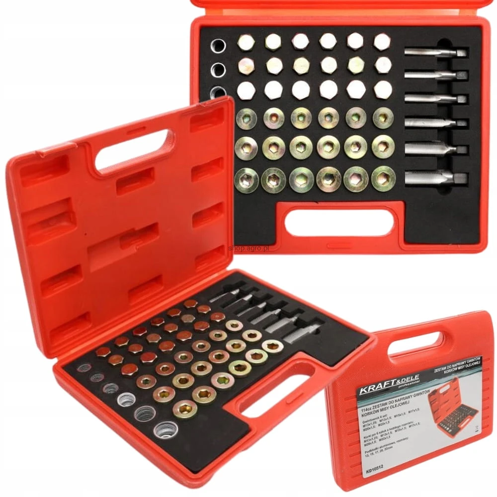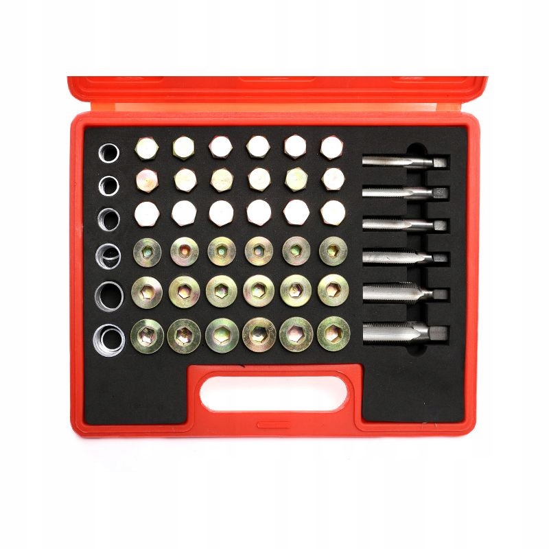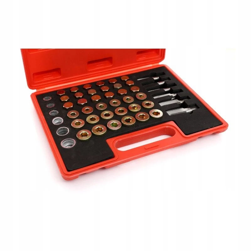 Składający się z 114 elementów, w tym różnorodnych gwintowników i korków, zestaw ten umożliwia szybką i efektywną naprawę gwintów korków spustowych miski olejowej, skrzyni biegów oraz innych komponentów, pasując do większości gwintów stosowanych w samochodach osobowych i lekkich pojazdach ciężarowych.