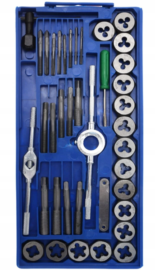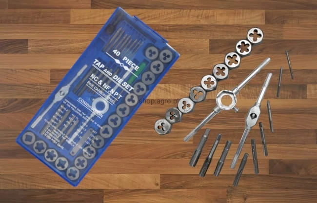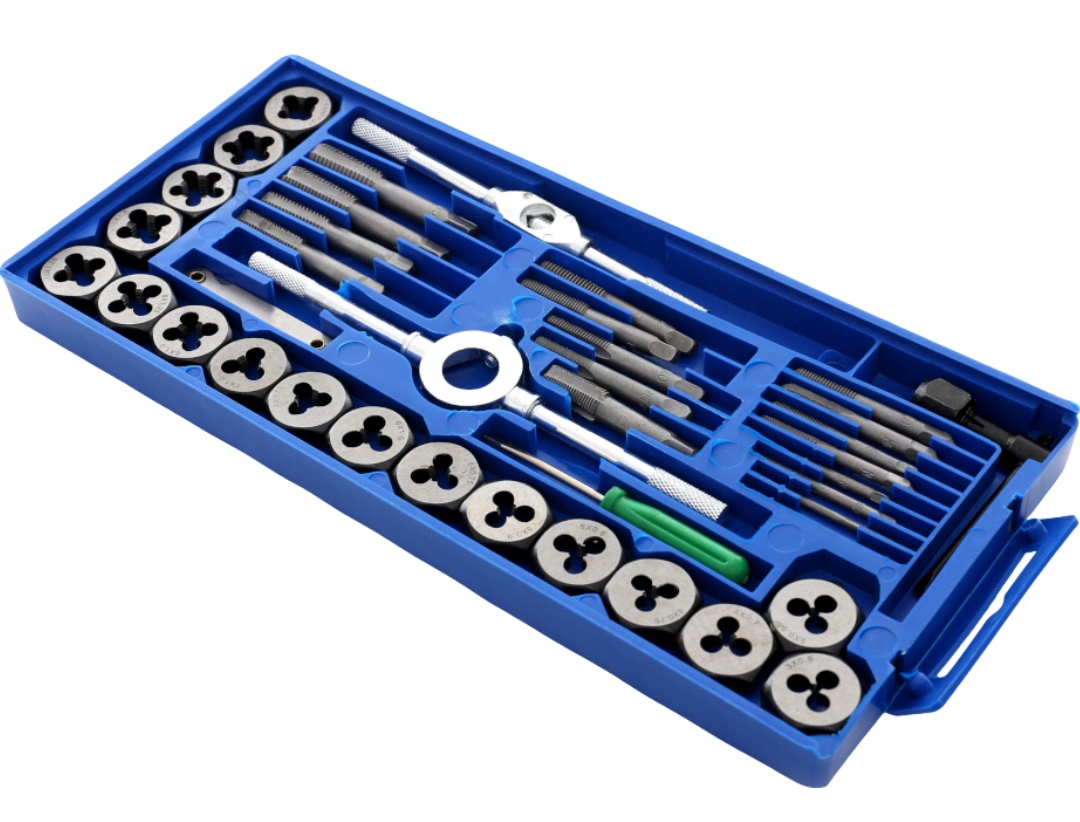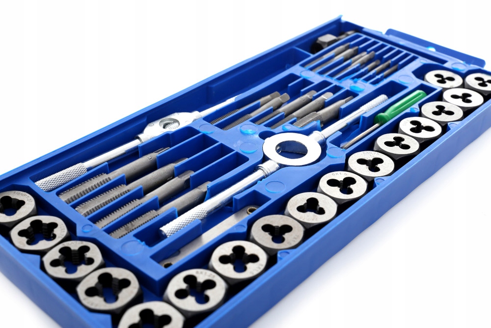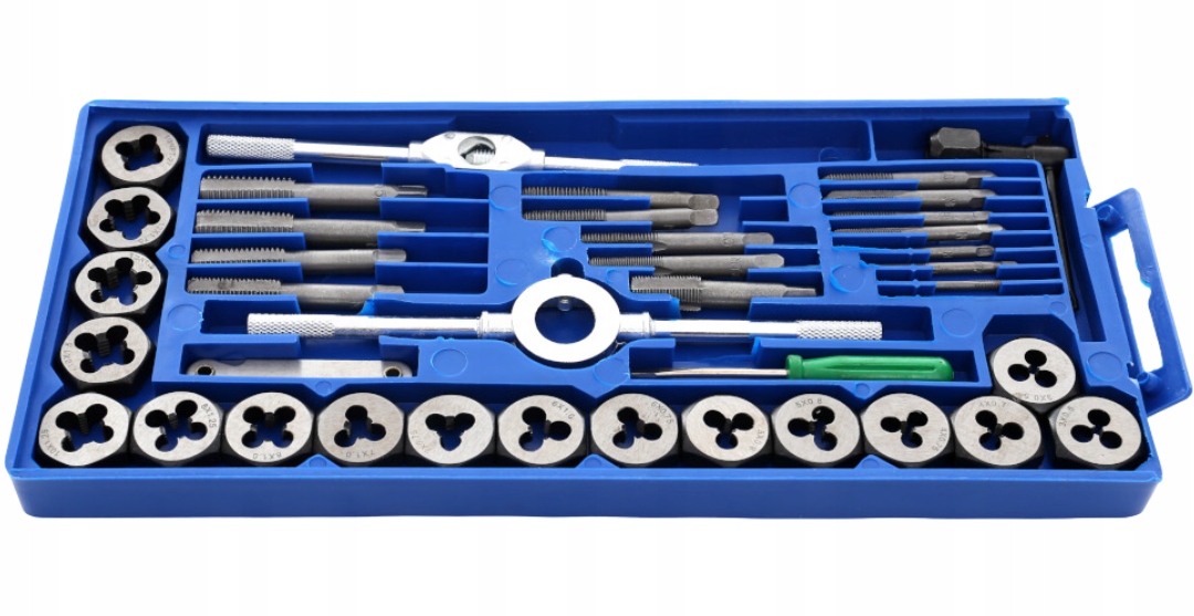 Zestaw narzynek i gwintowników zapakowanych w poręczną walizkę, dzięki czemu każdy element ma swoje stałe miejsce. Zestaw służy do naprawy połączeń gwintowych różnego kalibru.