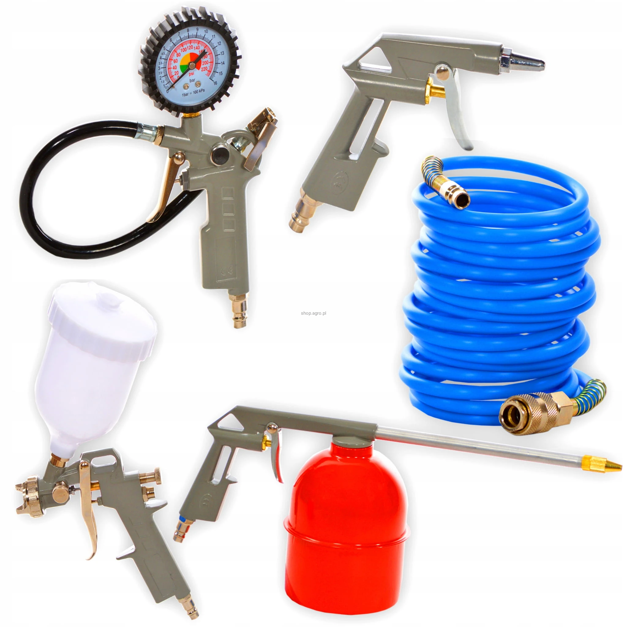- Pistolet do przemywania tzw."ropownica" ma długą, praktyczną dyszę rozpylającą, która ułatwia mycie i czyszczenie Pistolet do pompowania z manometrem jest doskonały do pompowania i kontroli ciśnienia ogumienia pneumatycznego. Posiada gumową obudowę zegara. Wyposażony jest w zawór spustowy powietrza.