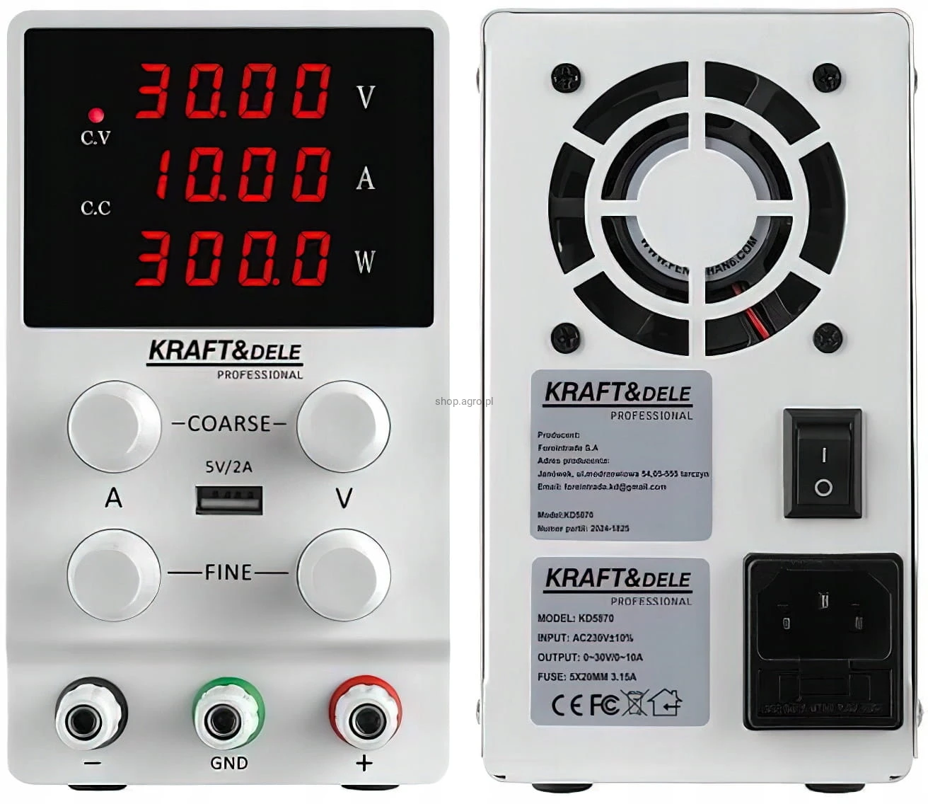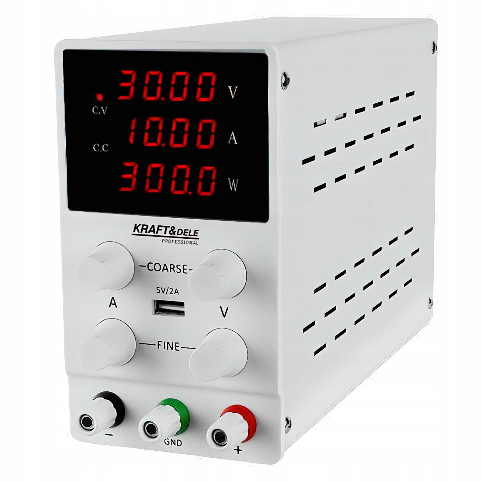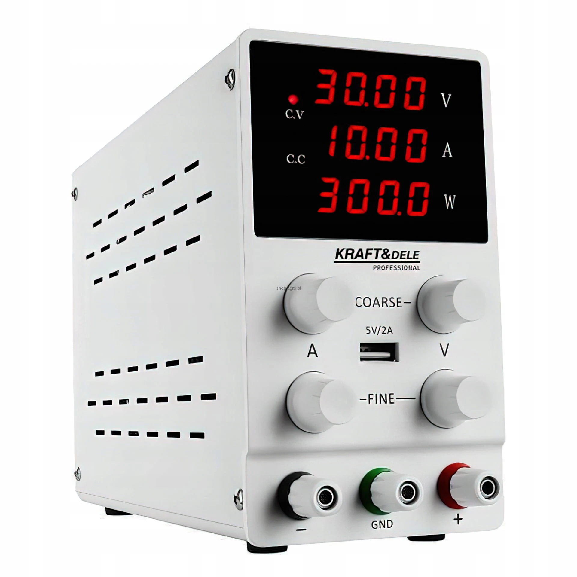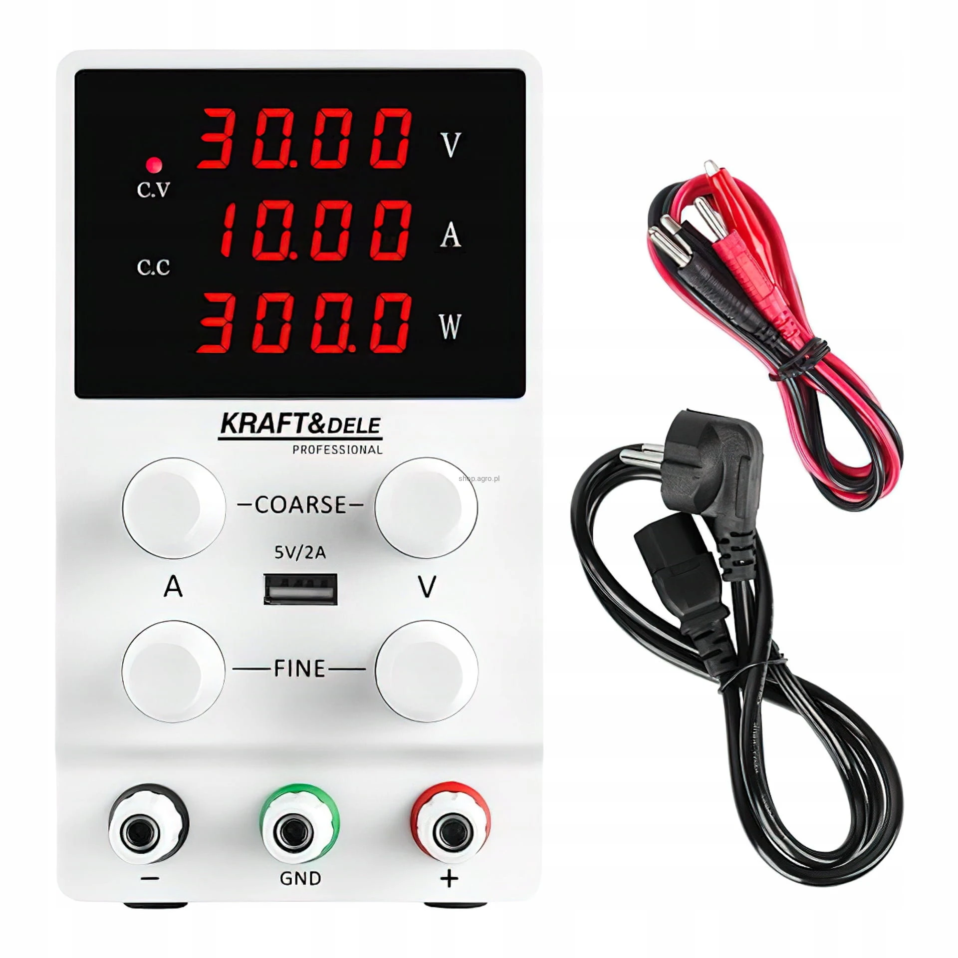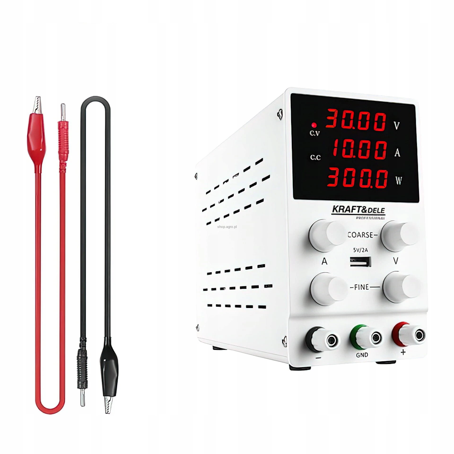 Zasilacz Laboratoryjny Regulowany 30V/10A LED USB Kable Krokodyl Kraft&Dele