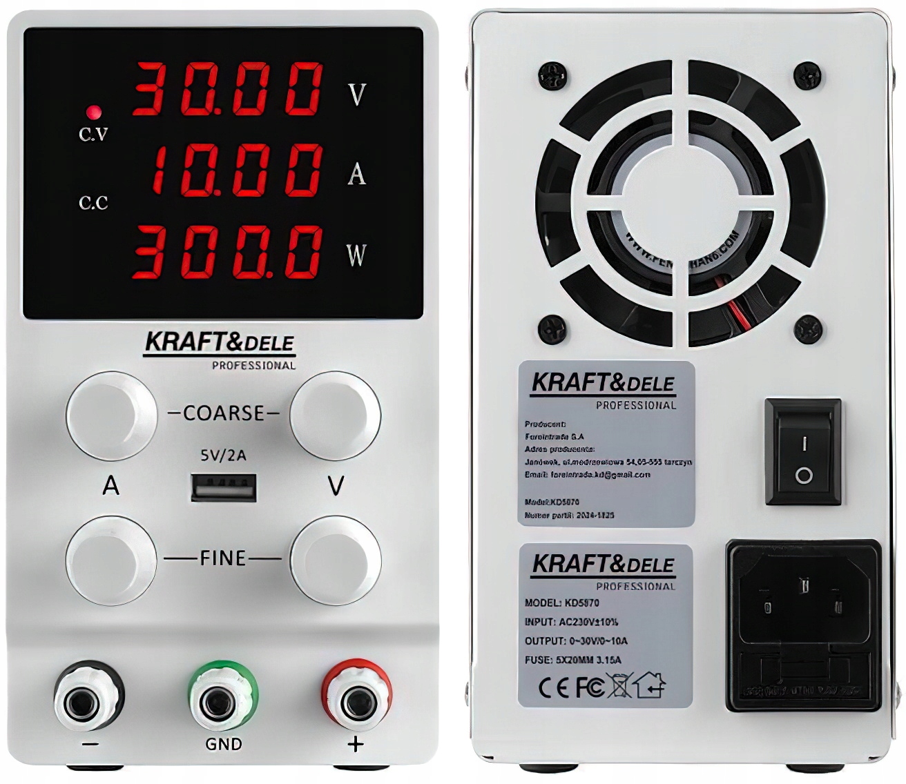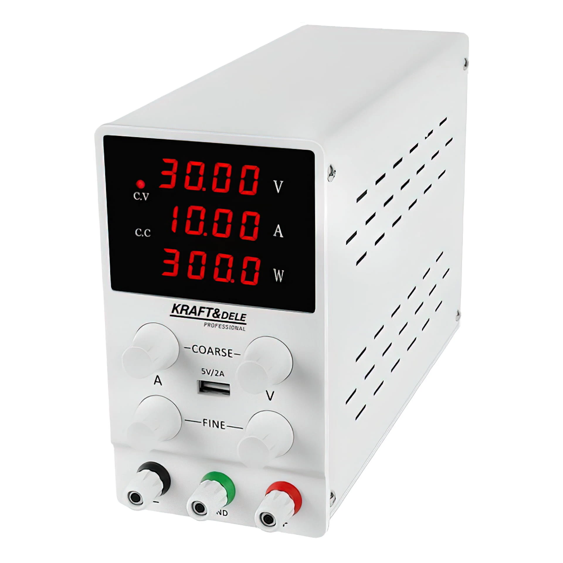 Precyzyjny zasilacz serwisowy marki KRAFT&DELE o regulowanym napięciu wyjściowym od 0 do 30V oraz maksymalnej wydajności prądowej wynoszącej 10A to urządzenie wyjątkowo niezbędne w każdym serwisie elektronicznym do przeprowadzania napraw i zasilania urządzeń o konkretnej mocy. Nasze urządzenie świetnie sprawdzi się również w domowym warsztacie oraz podczas prac naukowych.