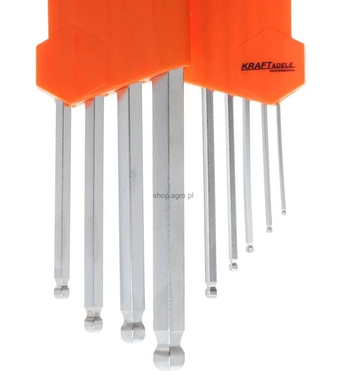 Zestaw śrubokrętów kulkoweych marki KRAFT&DELE. Imbusy zostały wykonane z wysokiej jakości stali chromo-wanadowej CrV, charakteryzującej się wytrzymałością oraz sprężystością.