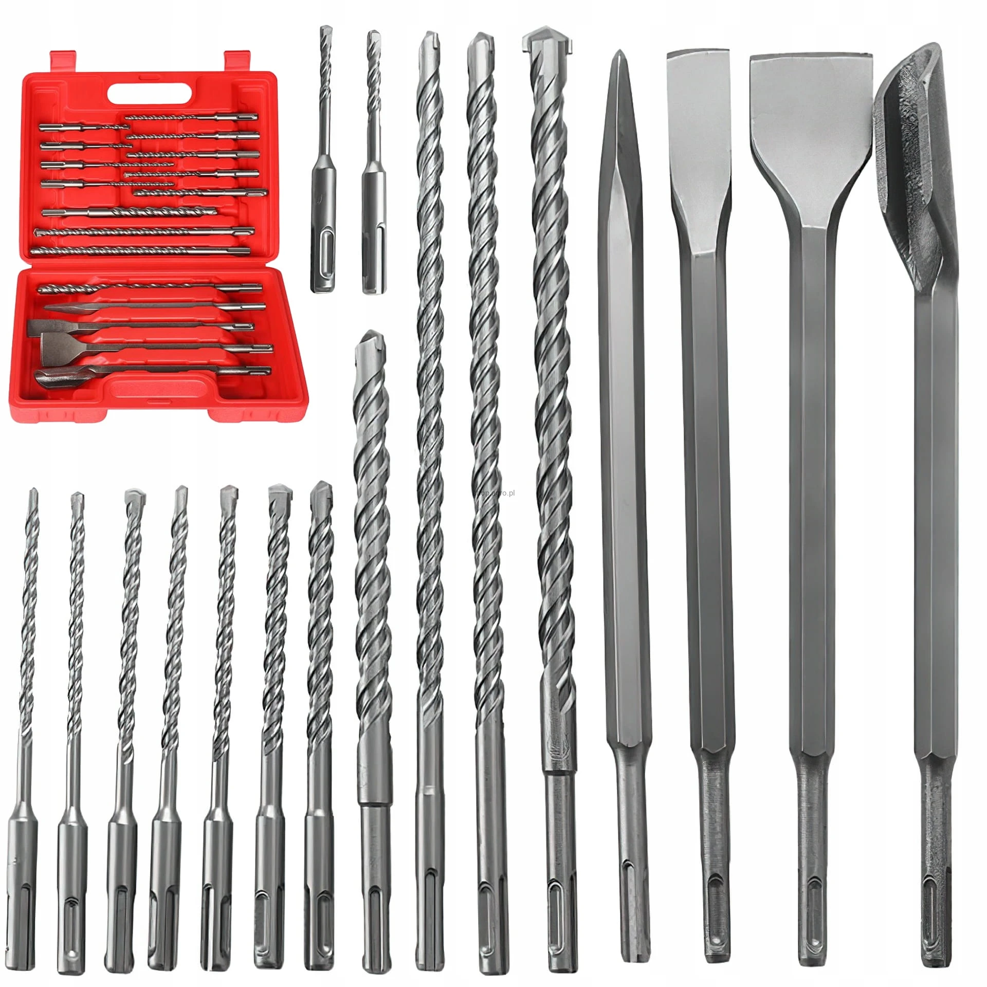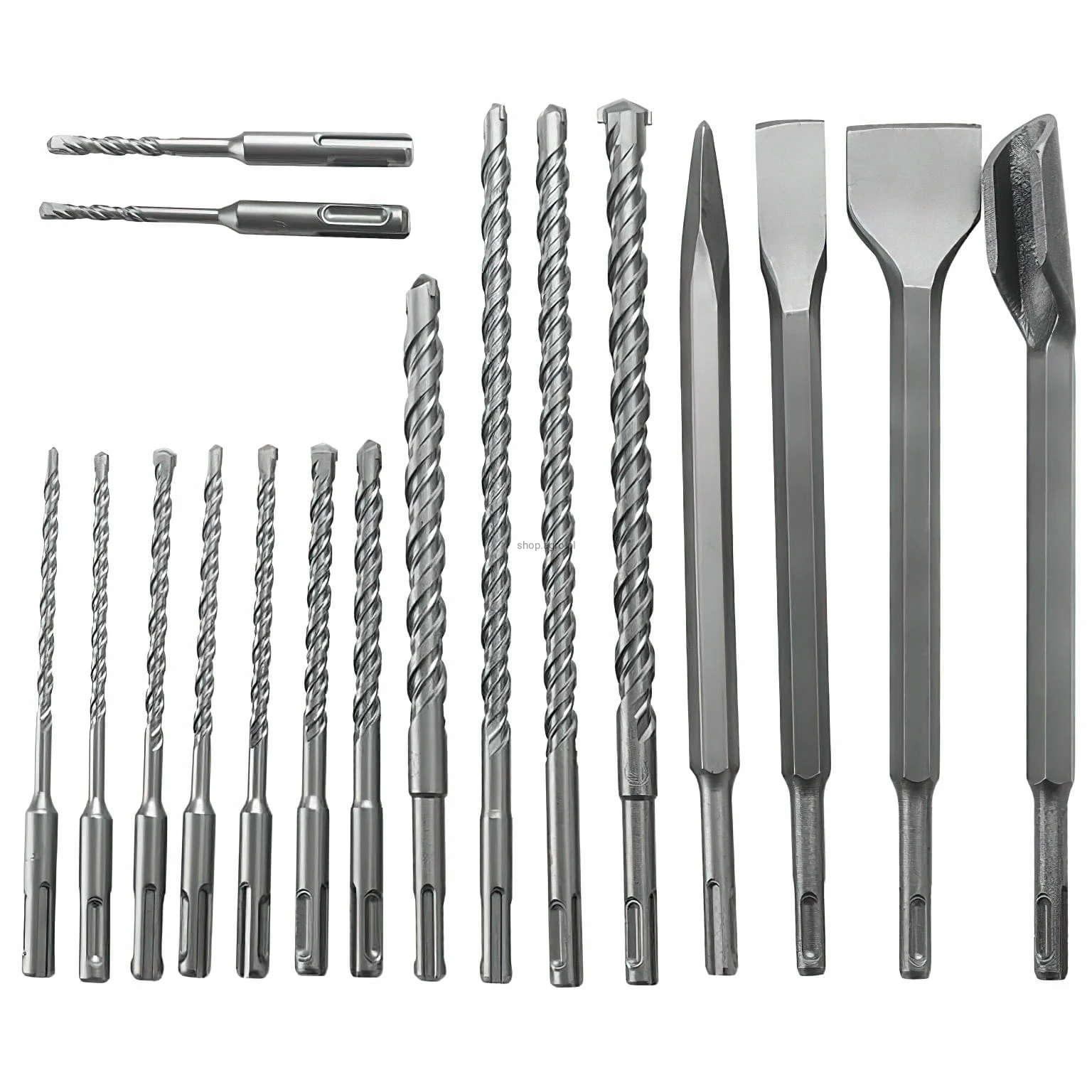 ✨ W skład zestawu wchodzą różnorodne wiertła do betonu oraz dłuta, które sprawdzą się zarówno w profesjonalnym warsztacie, jak i w zastosowaniach domowych.