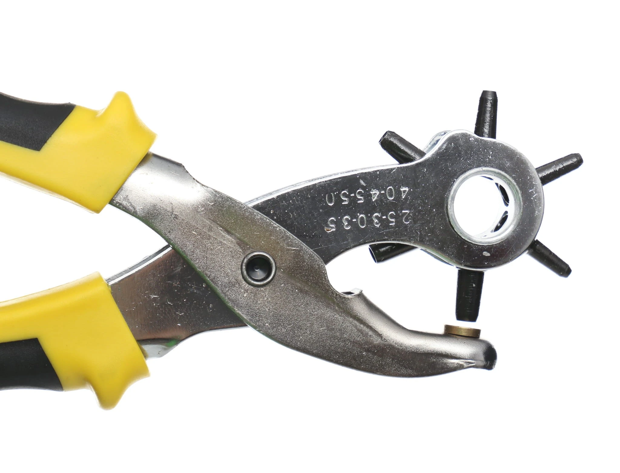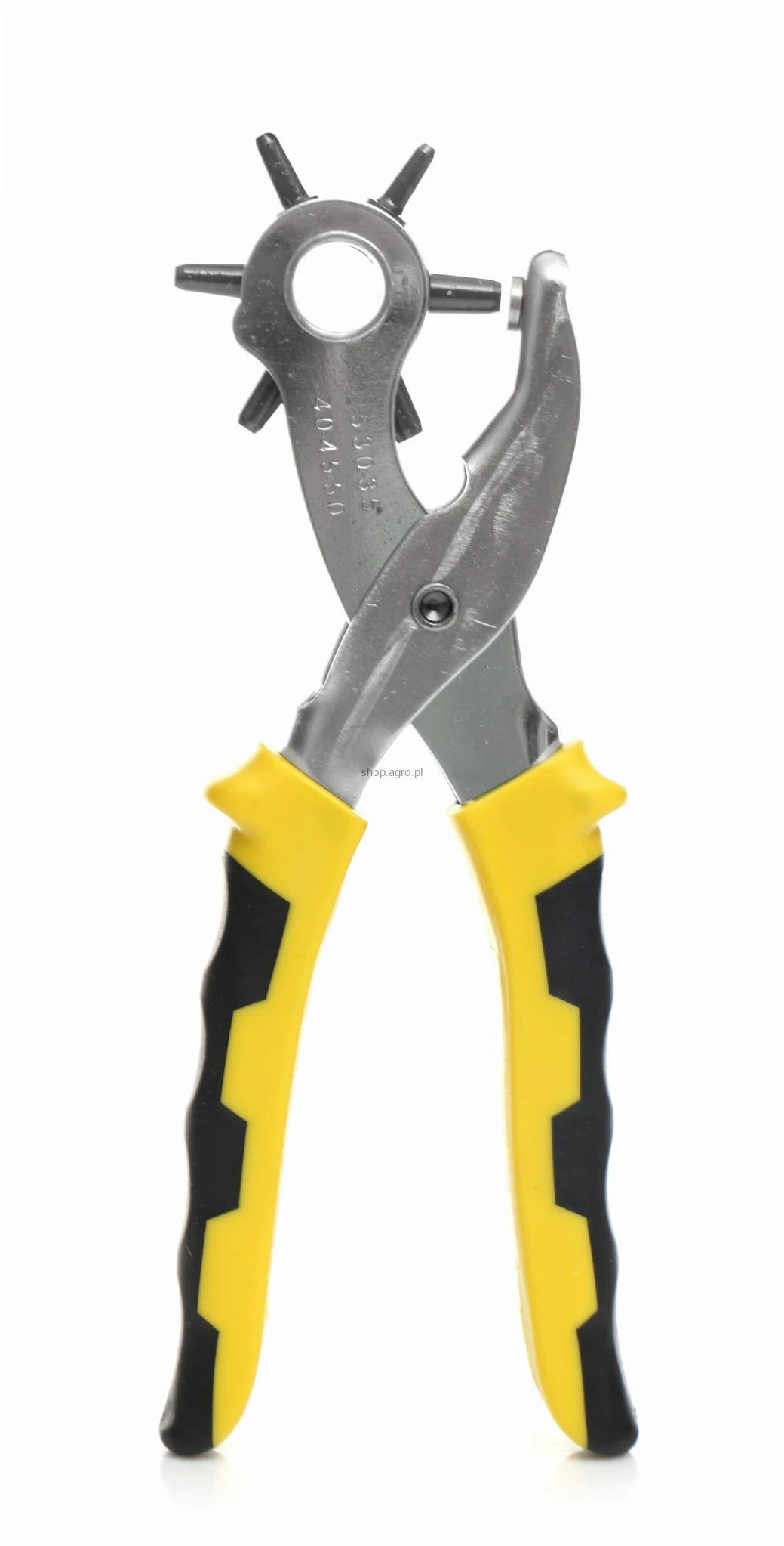 Rewolwerowe szczypce obrotowe do dziurkowania o długości 220 mm. Do robienia dziurek o średnicy: 2,5 mm, 3 mm, 3,5 mm, 4 mm, 4,5 mm i 5 mm. Szczypce przeznaczone są do robienia otworów w filcu, skórze, tekstyliach, foliach z tworzywa sztucznego, tekturze i w innych.