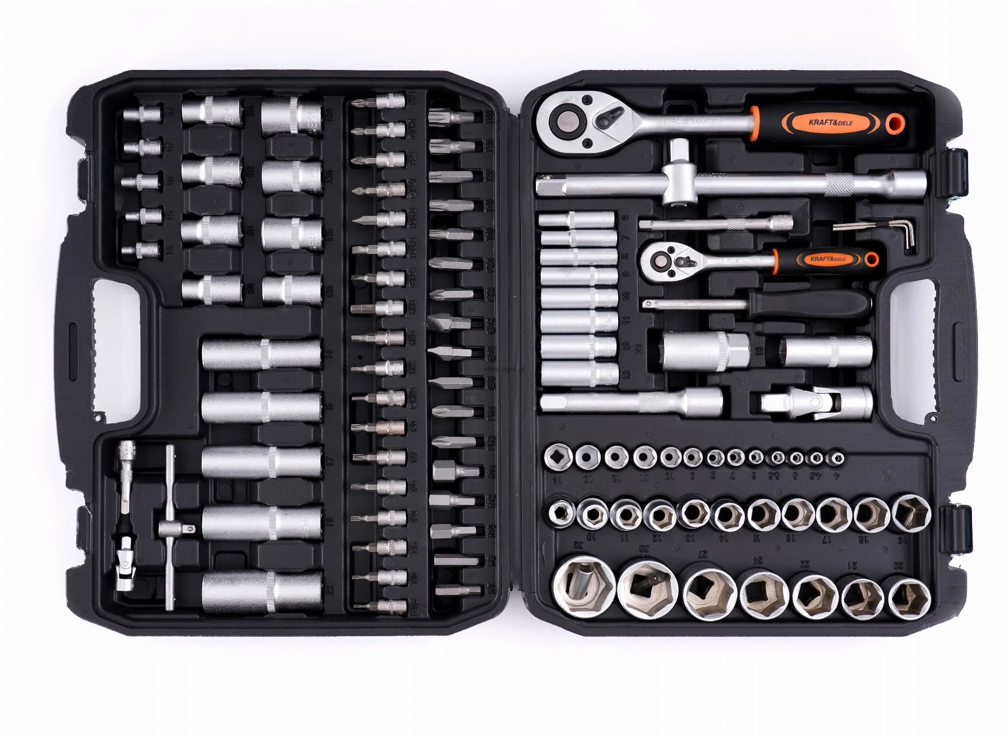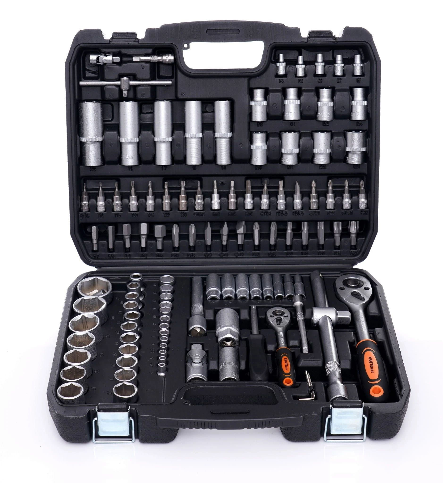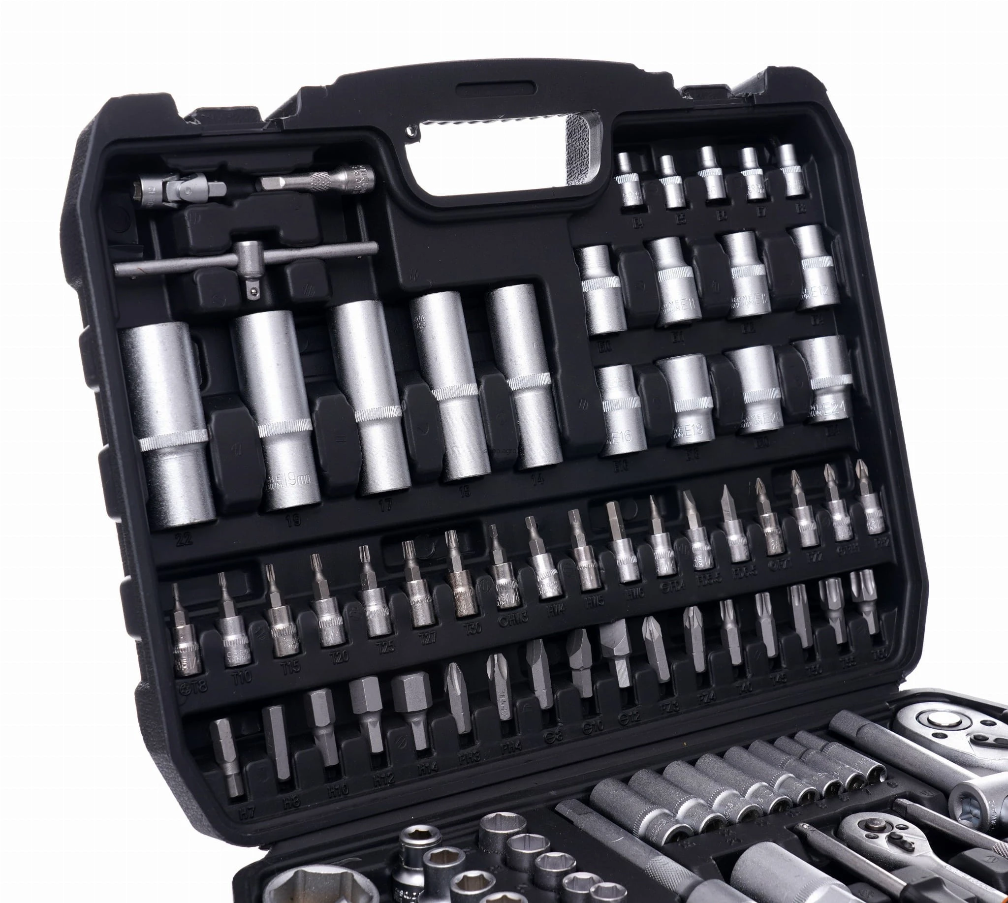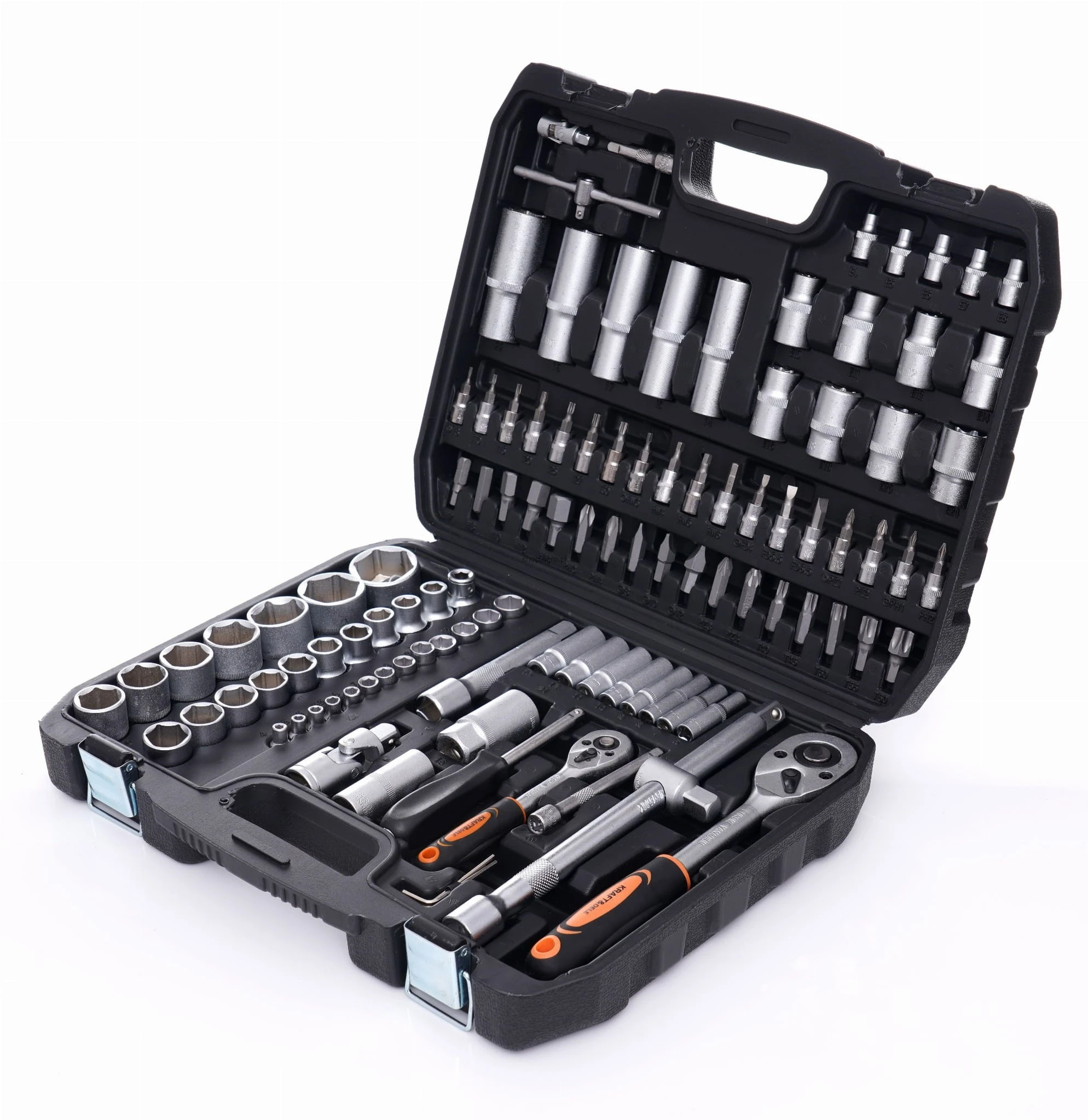 Cały zestaw składa się z 101 różnych elementów, które zapewnią odpowiedni dobór narzędzia do potrzeb. Narzędzia wykonane są z utwardzanej stali chromowo-wanadowej (CrV) przeznaczonej dla narzędzi warsztatowych. Chrom gwarantuje odporność stali na korozję, utlenianie, ścieranie i dużą wytrzymałość na wysokie temperatury. Dodatek wanadu hamuje wzrost ziaren podczas obróbki, zwiększając jednocześnie ciągliwość zarówno postaci hartowanej, jak i odpuszczonej.