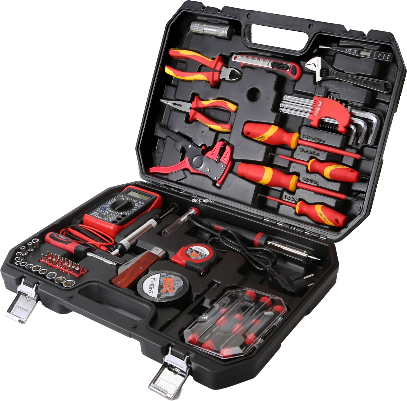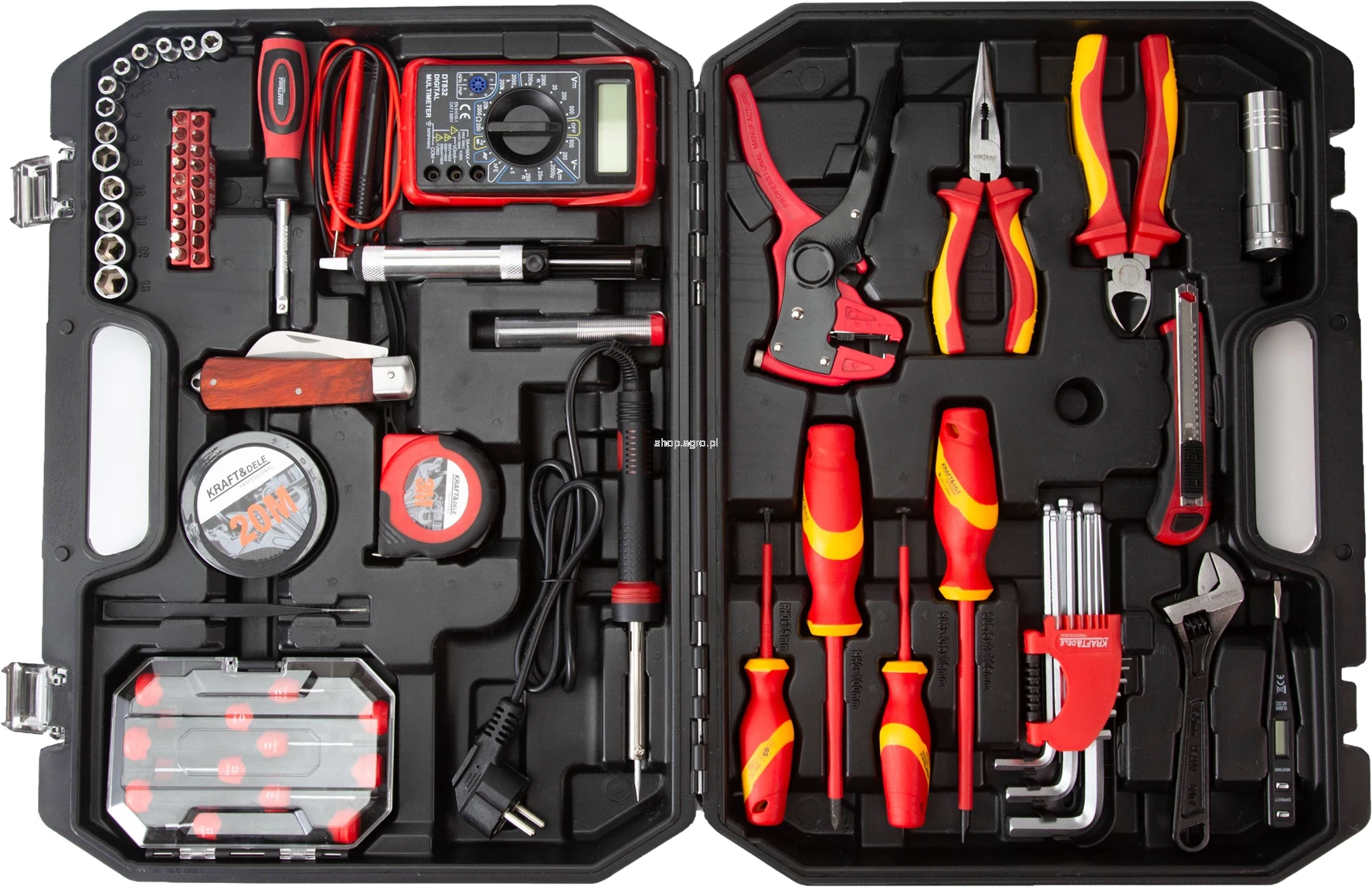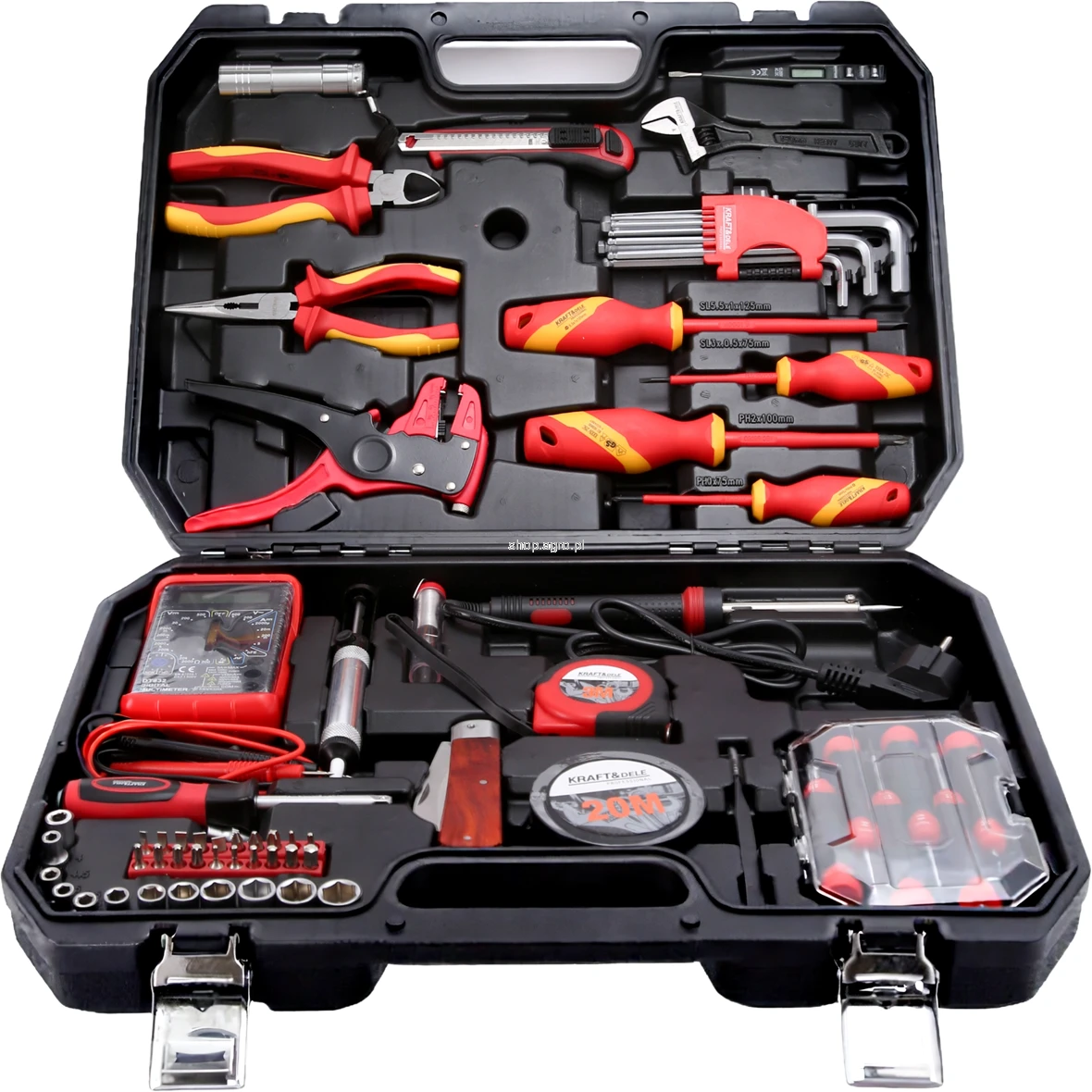KD5979 to bogato wyposażony zestaw narzędzi umieszczony w solidnej, trwałej walizce z odpornego tworzywa sztucznego. Idealnie sprawdzi się w domu, garażu, warsztacie oraz podczas prac instalacyjnych. Zestaw wyróżnia się wysoką funkcjonalnością, szerokim zakresem elementów oraz praktycznym rozmieszczeniem narzędzi ułatwiającym codzienną pracę.